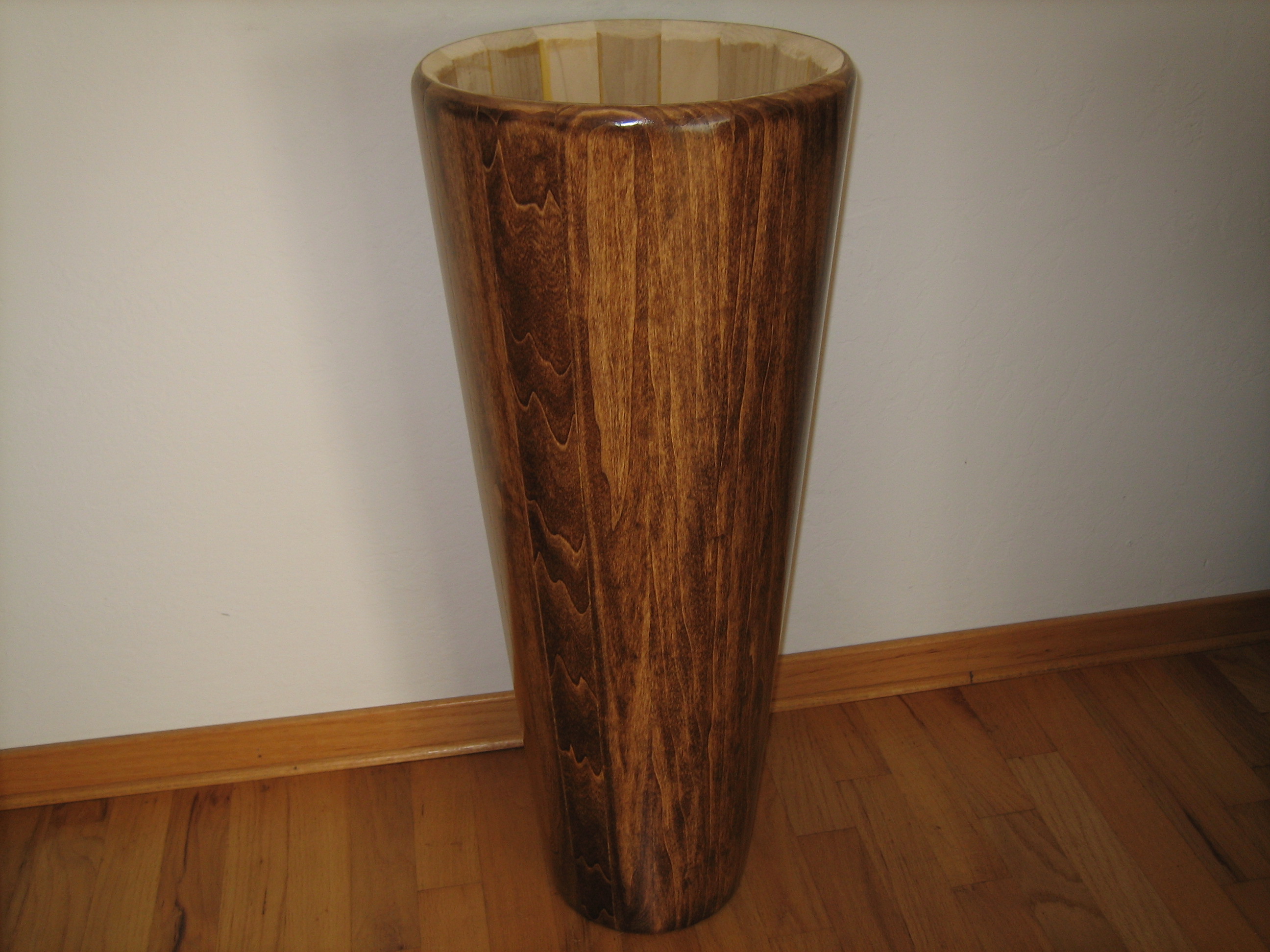 11 inch head x 28 inch high. I used 18 Poplar Staves, TiteBond III glue,stained and 3 coats of Polyurethane.