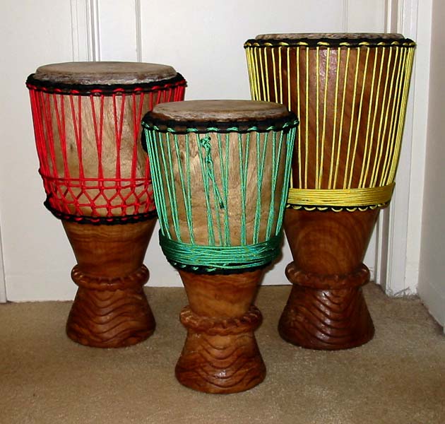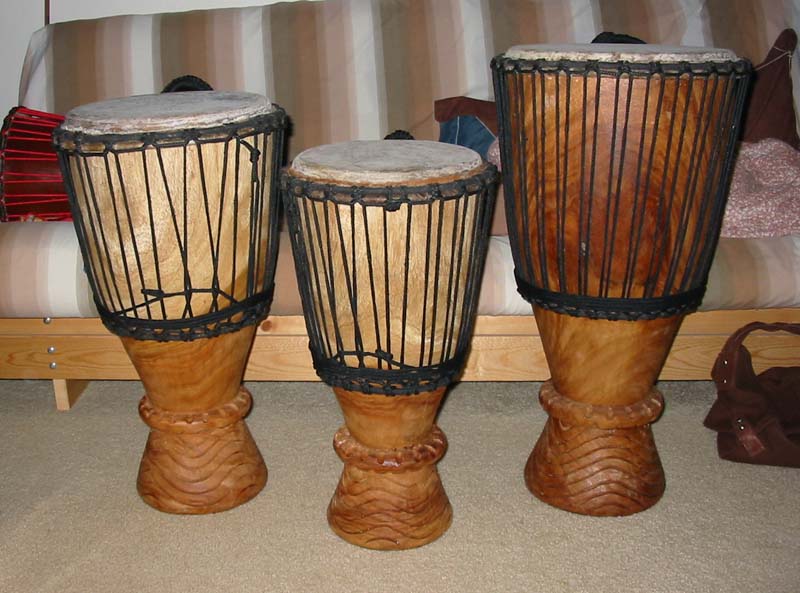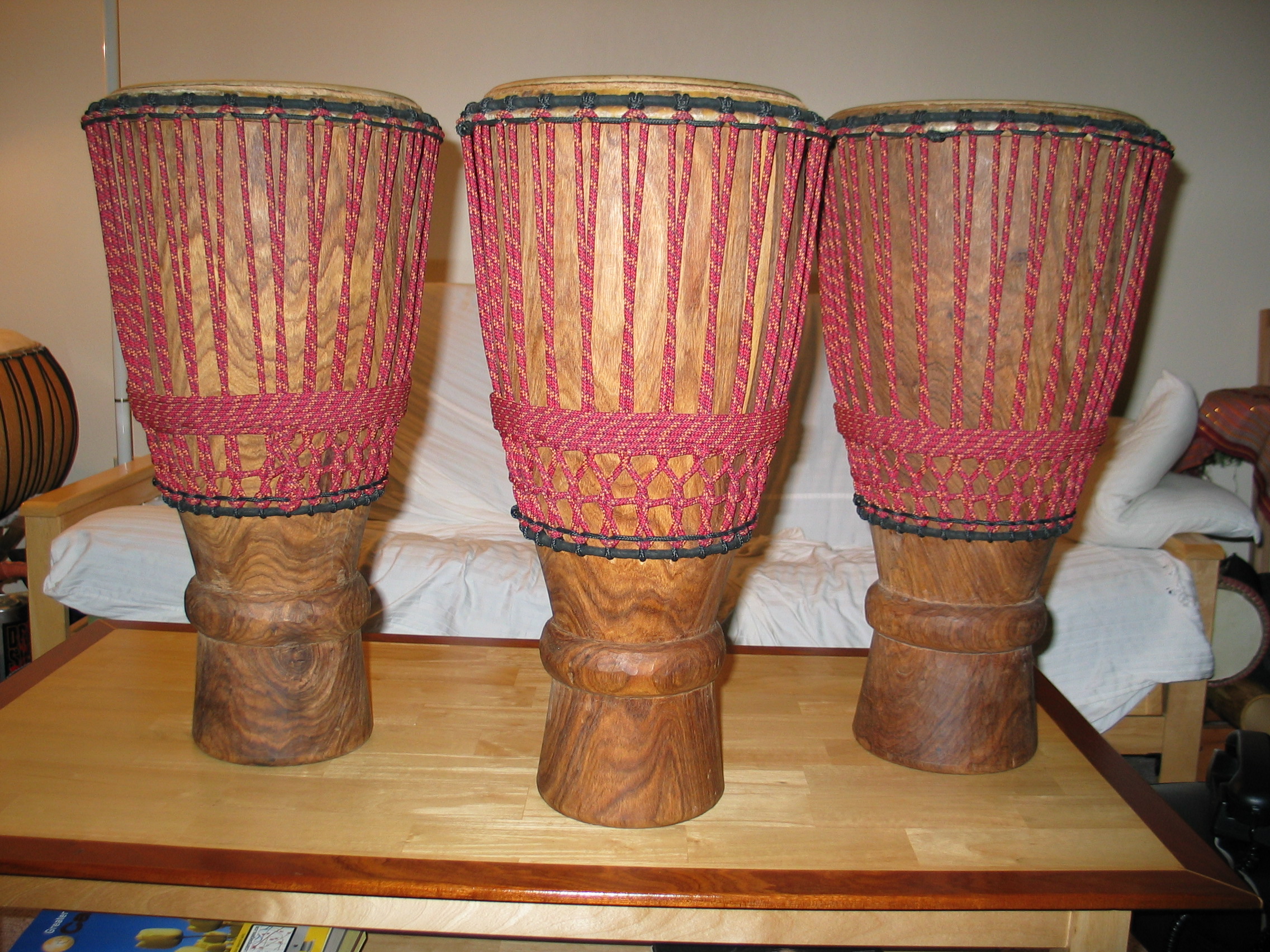Those are some really nice drums! I notice that your 'bougs have graduated height to diameter. Actually, most of the other ones that I've seen are like that too... hmmm. My three are 25" tall and are 10", 11", and 12" in diameter.