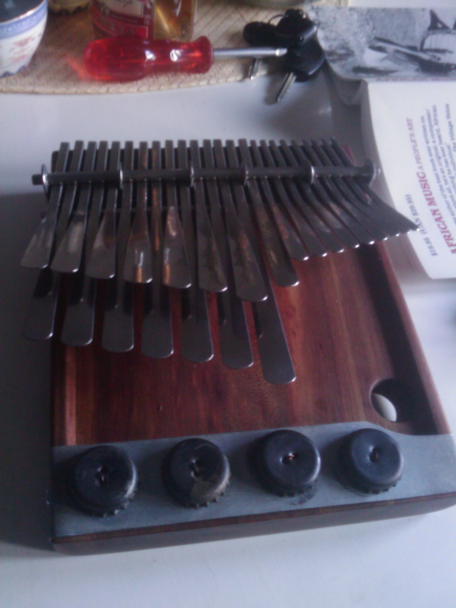 I will share my recent custom instrument I had a hand builder build for me. I saw on his web site a chromatic Marimbula. I asked him to push the limits of this instrument for me and now I have a 3 1/2 octave chromatic Marimbula with 2 seperate Marimbula boxes. The builder put all the white keys on one box and all the black keys on another. He told me this created better tonal clarity. He also added a 3 head piezio in the larger box and 2 head piezio in the smaller box.