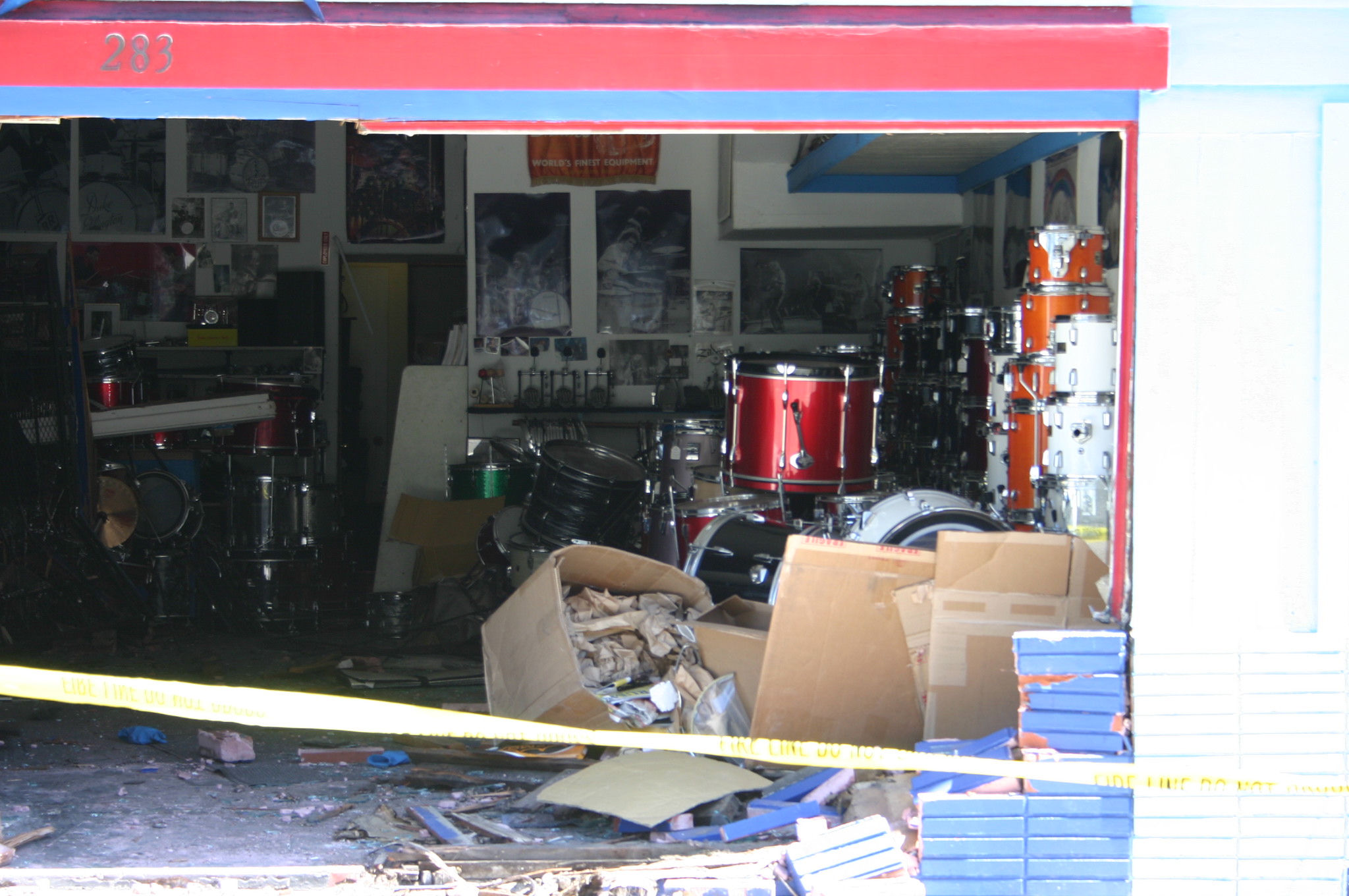 http://samadato.com/http://sfist.com/2008/07/31/hitandrun_d ... _sam_a.phpHoly Cripes! A little over two hours ago, a big 'ol gas guzzler crashed right into Sam Adato's Drum Shop, the preferred drum retail venue for local percussionists, at Ninth and Folsom Street. Check out the images (one more crash/snuggle shot after the jump!) and story sent in by reader Dan Rader:
