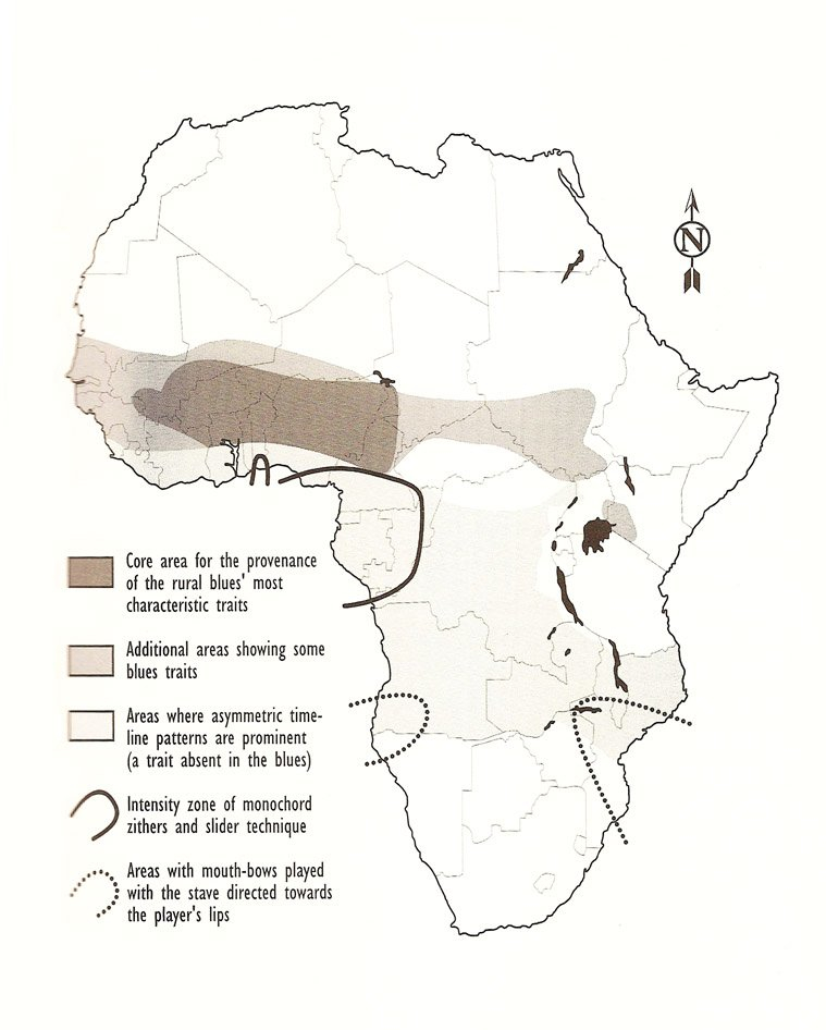 This map shows those areas in sub-Saharan African where blues traits are found in traditional music. From Africa and the Blues by Gerhard Kubik (1999).