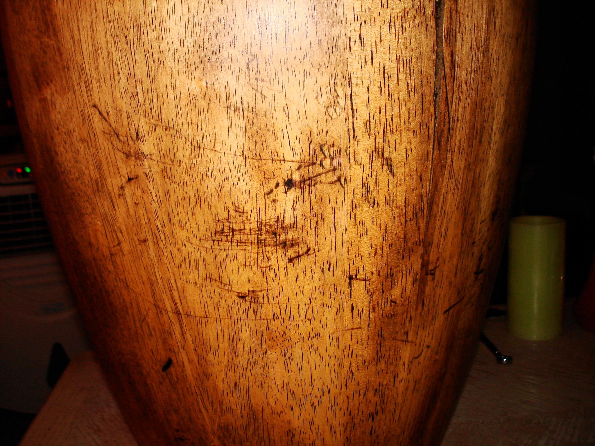 "Derbeno, use a good stripper with methelyne chloride in it. Do it OUTSIDE to avoid fumes. Sanding should always be the last resort for stripping. If you do sand, use a random orbit sander with a vacuum hose connected to the vacuum cleaner/dust collector. Otherwise you'll get small spirals that will show up when you put the finish on. Use grit around 200-220 and final hand sand with 220 going with the grain always. One responder mentioned an oil finish. I assume he meant a danish oil finish. It is easy to touch up. Just add some of the oil and hand sand with the grain with 200-240 wet or dry sandpaper. Some of the sanding sponges work well. They are about 5X5 inches and 2 sided. The sanding will work up a mix of oil & sawdust. Follow the directions and this will allow the mix to go into the scratches and build it a little. It really is foolproof. You get a nice soft looking satin that is easy to touch up. You're going for ease of mantainence, not durability. You can also coat with many other types of finishes later if you want depth and build. Watco Danish Oil finish is a good one. Also, Geo. Maloof, a famous chair builder, sells his own mix. I haven't used it, so I can't offer an opinion. Also, Waterlox makes a nice wipe on oil that is beautiful . A friend of mine who has been in Fine Woodworking 3 times, with 5 pages the last time, uses it on pieces that go for 10,000.00 and more. Its basically the same as the others. Remember to never pile the used rags up. They will spontaneously combust and burn your shop down! Good luck. Buck"