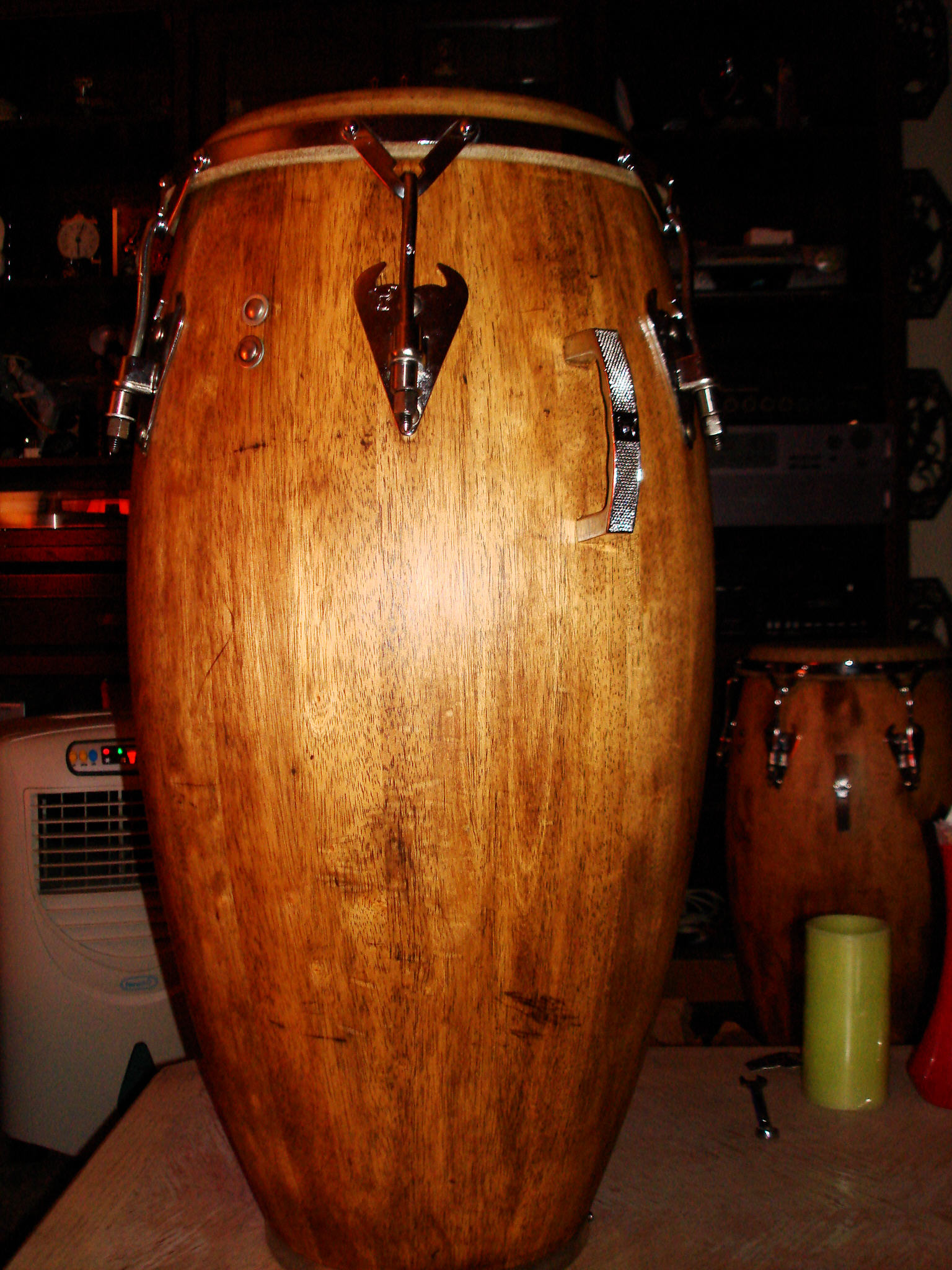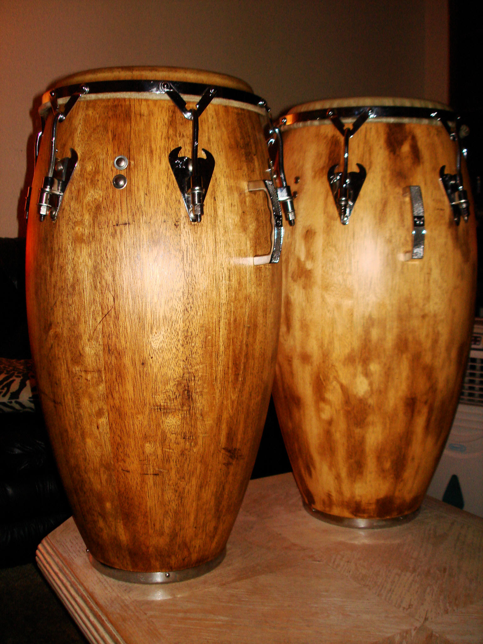 Very Good Advice. When you are refinishing always strip and keep sanding to a minimum specially with old pieces, you do no want to cut into the patina. Watco Danish Oil is a good choice but according to what I know is not an oil 100 percent is more like a varnish/oil blend. The problem with Watco and other oil finishes like Boiled Linseed OIl and Tung Oil is that they will not offer a lot of protection and if you want a protective top coat most likely you have to use oil poly. Normally oil finishes are penetrating and it will take a lot of coats and time to build-up a finish with oil and probably be a tacky finish. I think with bongos you kind of can get away with just a penetrating oil finish, but not congas they seem to get more dings. Oil finishes with no other top coat are very attractive but they are better suited for pieces that are not going to received a lot of abuse, since the wood will be directly receiving every scratch, gouge, ding etc. No doubt you can use an oil finish in your congas but for maximum protection you will always need a tougher top coat like poly and if possible gloss since is harder than the semigloss or satin. I have been refinishing some of my drums all summer long and I really have been buying books and doing lot of reading on finishing wood. You got to take your time, and don't rush. There are countless products for finishing wood but you need to know what is compatible with what and be careful with them rags after you use oil stain, varnish etc they are very flammable. What I do is lay them flat inside my BBQ grill overnite with all the vents close just in case, when the rags are hard and stiffed you can dispose of them:)