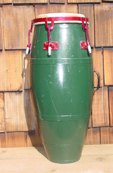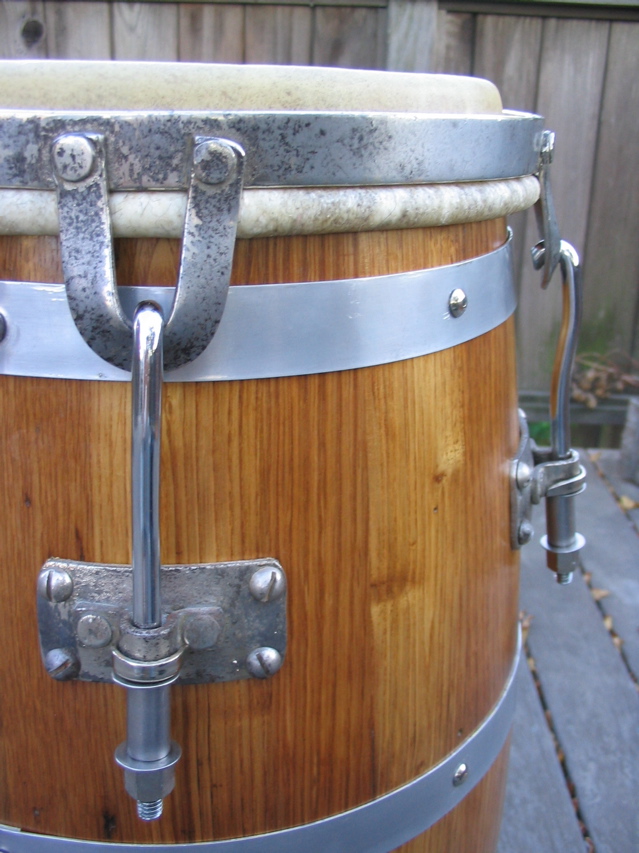 Here a some other photos of likely Requena congas. Mine was a wreck when I got it: splits all over - almost fell apart when I took the head and bands off, hardware completely rusted over, etc. Took a lot of work to get it into good playing condition.