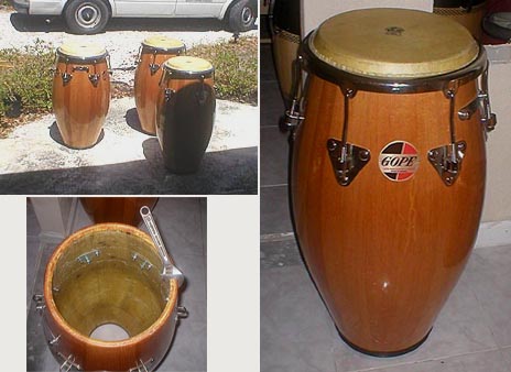 Well the congas have arrived, Thanks to Vinnie for holding them for a few days and the Miami guys for not buying them. I do stand corrected or may be not. At first look I thought they were Bauers, but in this case the label is Gope,but you tell me are they or not Bauers. Gope is known for their Brasilian batucada instruments. This is the second time that I see this... remember the post with Colombian percussion making and labeling their product with Ritmo Tropical.