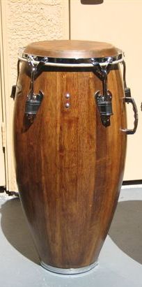 Sumo, I don't recommend sanding as a method of stripping. I repair & refinish furniture for a living and only strip when I absolutely have to. I'd recommend one of the new non toxic strippers that is water washable and soy based. It will soften many finishes. When it softens the finish, start using a paint scraper in the direction of the grain to remove finish. Sandvik makes one with an orange handle that has a replaceable/sharpenable blade. Use 2 hands and try not to gouge the wood. Once most of the finish is off, reapply the stripper and use warm water and coarse steel wool or fiber pad to clean it up. Then start with the least coarse grade of sandpaper, probably around 100 and work up to no higher than 240, always going with the grain direction. If you use a finer grade of sandpaper you will burnish the wood fibers and the stain and/or finish won't go on evenly. I would hand sand with a block. Conga drums aren't that big. A good wood filler is white glue with sanding dust from the project. For finishes, you have many choices. Matthew Smith uses an over the counter oil based poly that he brushes on. Minwax Wipe On Poly has given me good results on furniture, also. I have lots of water based clear finishes that were sent to me free by distributors (does that make me an endorser-probably not-LOL) so, I use them. I like to spray and can build the finish rapidly. I'll post pics of my GonBops that I'm working on, when done.