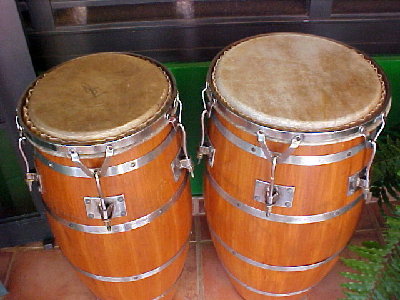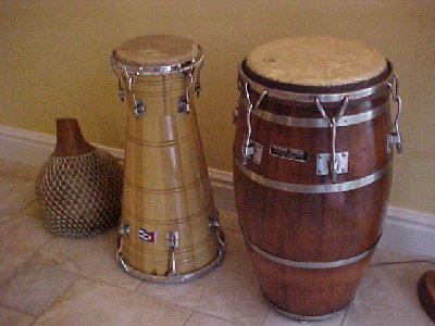 Here is a photo of me in the middle of Ismael's son, Junior and his widow. This was in the summer of 2006. I heard the store closed shortly after that. This set of Ismael's is the best set I have had, they are very well made from P. Rican caoba. Previously I had an oak (roble) set that will split on me every so often, I sold them. Then I had two really huge Timbas that were very wide at the bottom and sold them as well. Here is a photo of one of them.