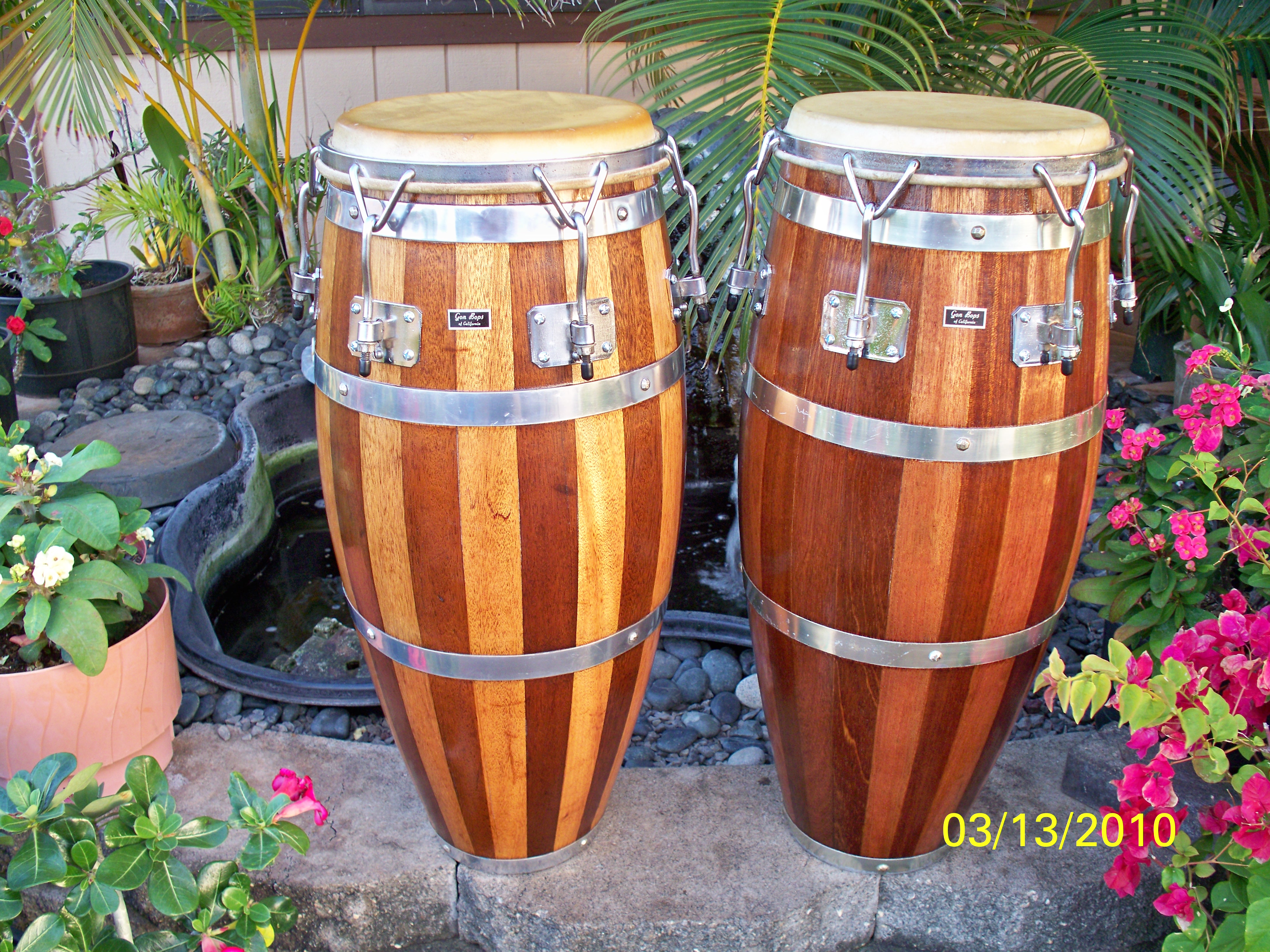 Attached are pic's of a pair of 1950's Gop Bop Mahogany Congas I found on Craigslist a few months back. Both have 10 1/2 inch heads, 6 lugs and both came with, what looks like original alma's. I sanded them down, tinted them in a alternate pattern stave and hand rubbed them with several coats of oil. They stiill have the original heads that still have some great ol skool sound!! Wicked slaps and dry open tones!!