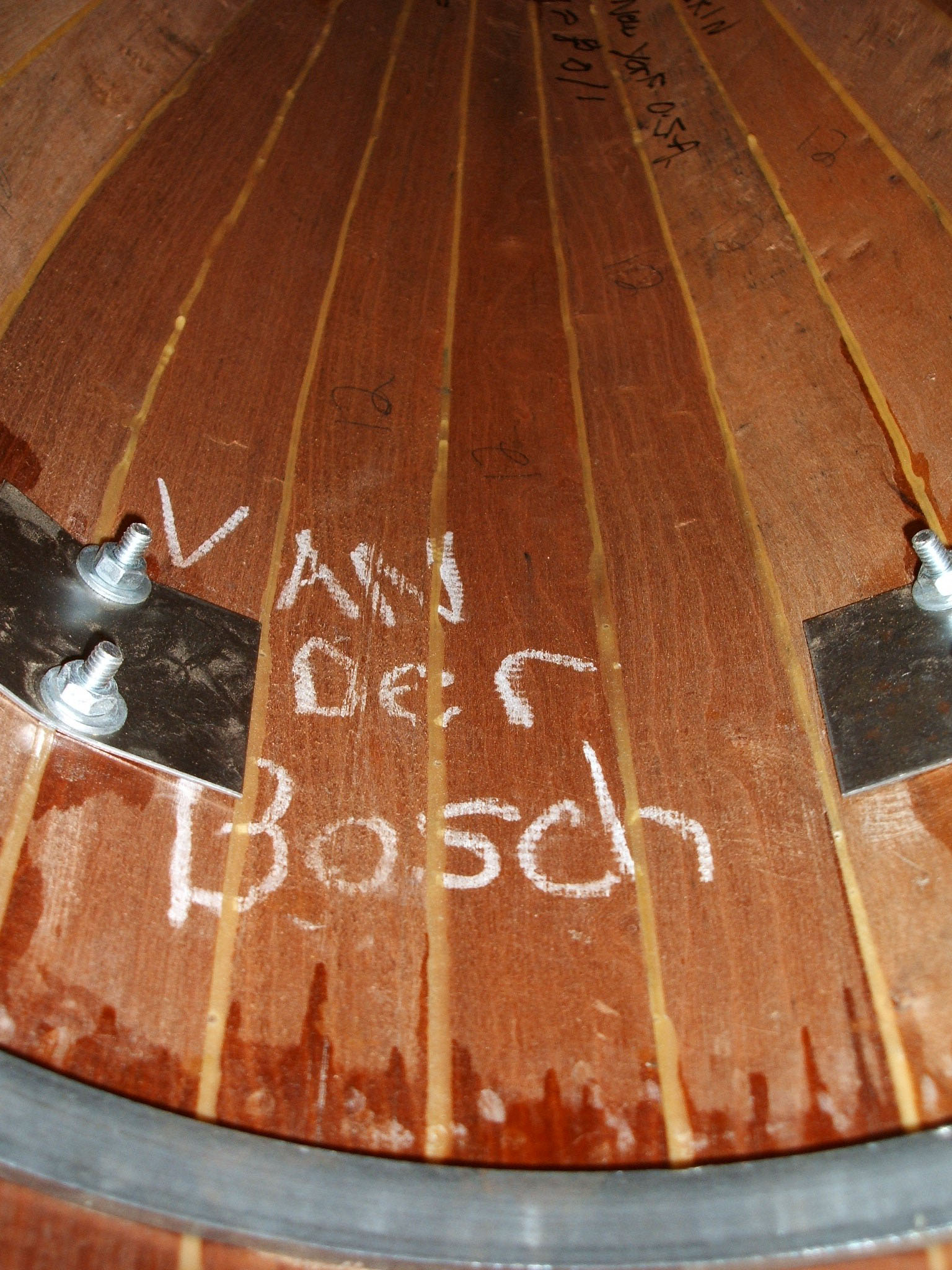 No I didn't notice anything like that on the bearing edge. This was the tres dos, you can see the number 12 written on several staves for a 12" tres dos. The other drum is 13".