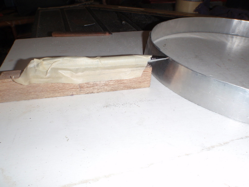 Hoop is centered on axis, and then marked at 90 degree intervals to drill holes for screws, which will hold hoops to shell.