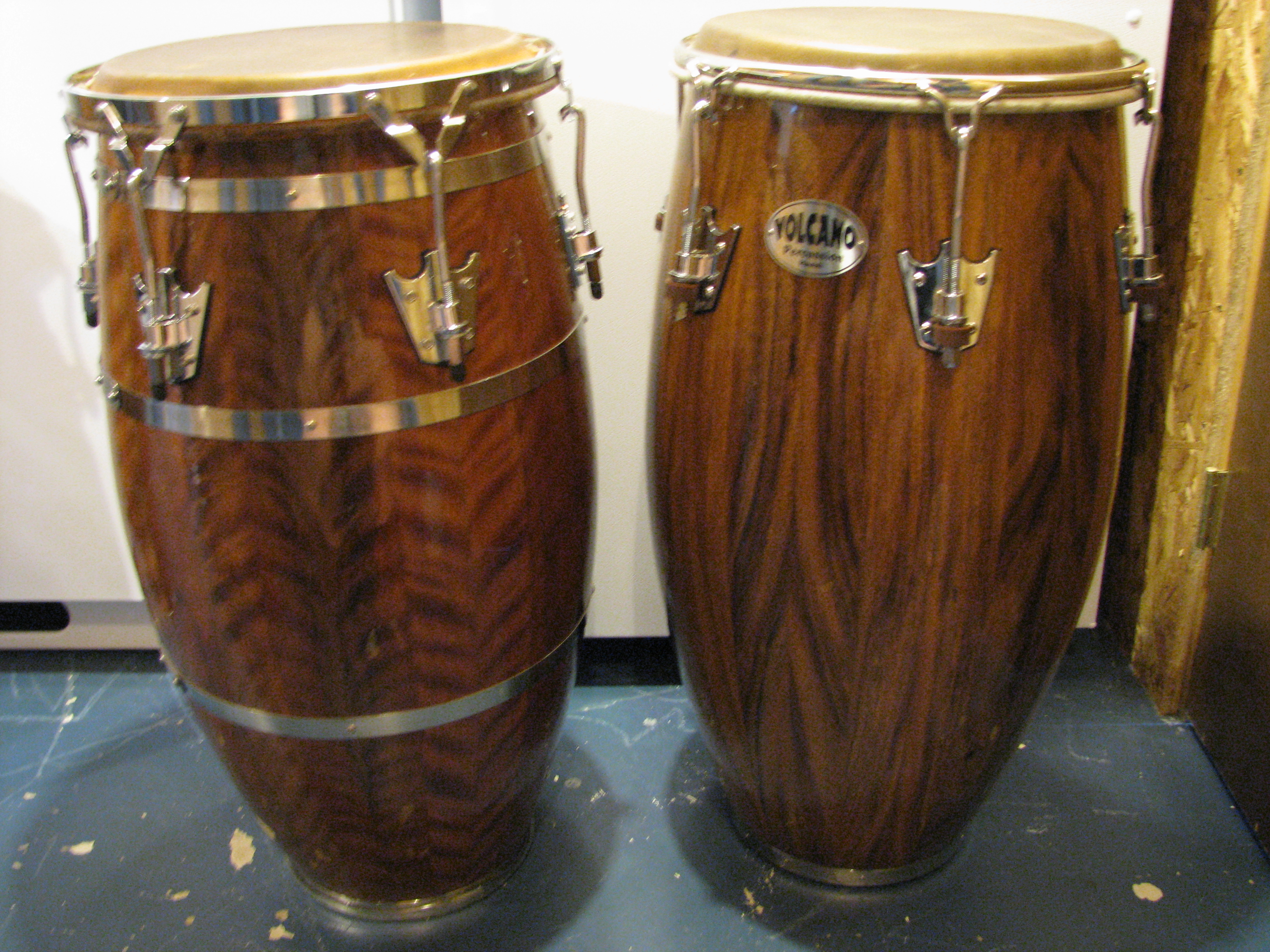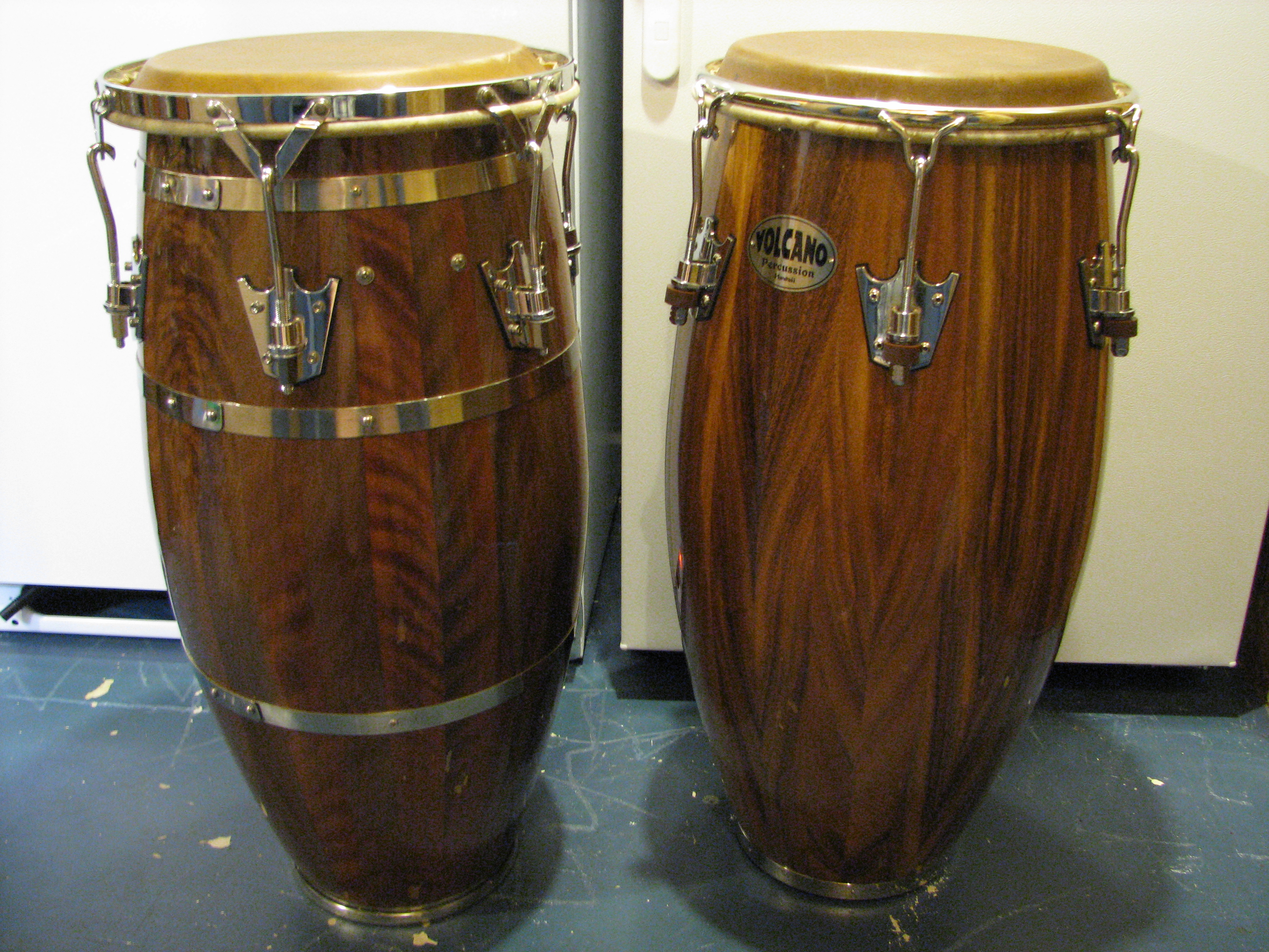 I have recently acquired a very rare set of congas graced by 2 hand builders of some of the finest congas today (Tom Alexander of Volcano and Matthew Smith of Ritmo). This set of Ohia wood Volcano congas are among only 6 that have ever been made by Tom at Volcano. Much to his credit, Tom quickly discontinued this line of congas due to issues with the wood's density and the amount of wasted material. Tom long had the dream of using Ohia wood (the true volcano wood) to build congas but this feat never had been performed prior to these few.