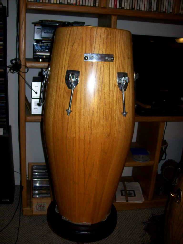 Your Valje is missing the crucial bottom band , without it, the drum can & will crack easily ! This early model is from the original garage shop and is out fitted w/ a Gon Bops conga mount which if you find a way to complete a up graded version of the stand ( I have the mount ) is a better choice than Asian models w/ extended ears that scratch and dent adjacent drum shells. It is a great drum, but be cautious not to mount to thick of a head on it since the side plates lud saddles are known to bend out of position and damage the hook threads. I hope you find a match !? To make a new band ~ I would tape light carton board to the bottom circumference, very tightly and including an 2 " overlap ( representing the metal band over lap which was rivited ). Trim the excess off the bottom, measure and cut an inch & a half ( 1 1/2 " ) band from this template until it represents the original band. Now... lay it out flat & it will look like a curved blade. This is the shape to have cut from 1/16 th " stainless steel ( perferably ) and wrap it around the base of the drum, measure where it fits w/ the over lap. drill 5 evenly spaced very small holes in the center line of the band for the furniture tacks that will anchor it into place later. Now, you need to drill 2 holes into the over lap portion about an inch apart so you can use flat head rivets to join the band securely. It should resemble the original band now. use autu wax on the drum at seal the wood and lubricate the band for mounting. Press it on by hand after you align the overlap to be under the handle as a bench mark for any other bands to be simularly aligned. Hand press it on as close and tight as possible, next, use a wide strong metal plate laid over the band while the drum is upside down ( the drum head and hardwares should be on and tuned med. tight to keep this process from cracking the drum, a few adjustable starp should also be used at the waist to hold the drum tightky togeather as well at the waist ) Place the drum head side on a carpeted floor to cushion the drum. Now...use a hammer to tap the steel plates u placed on the band untill its flush w/ the bottom, and cont tapping while using a straight edge on the edge of the band , a bit passed the wood bottom., secure w/ furniture tacks, by pressing then tapping w/ a mallet or hard wood...not a hammer !