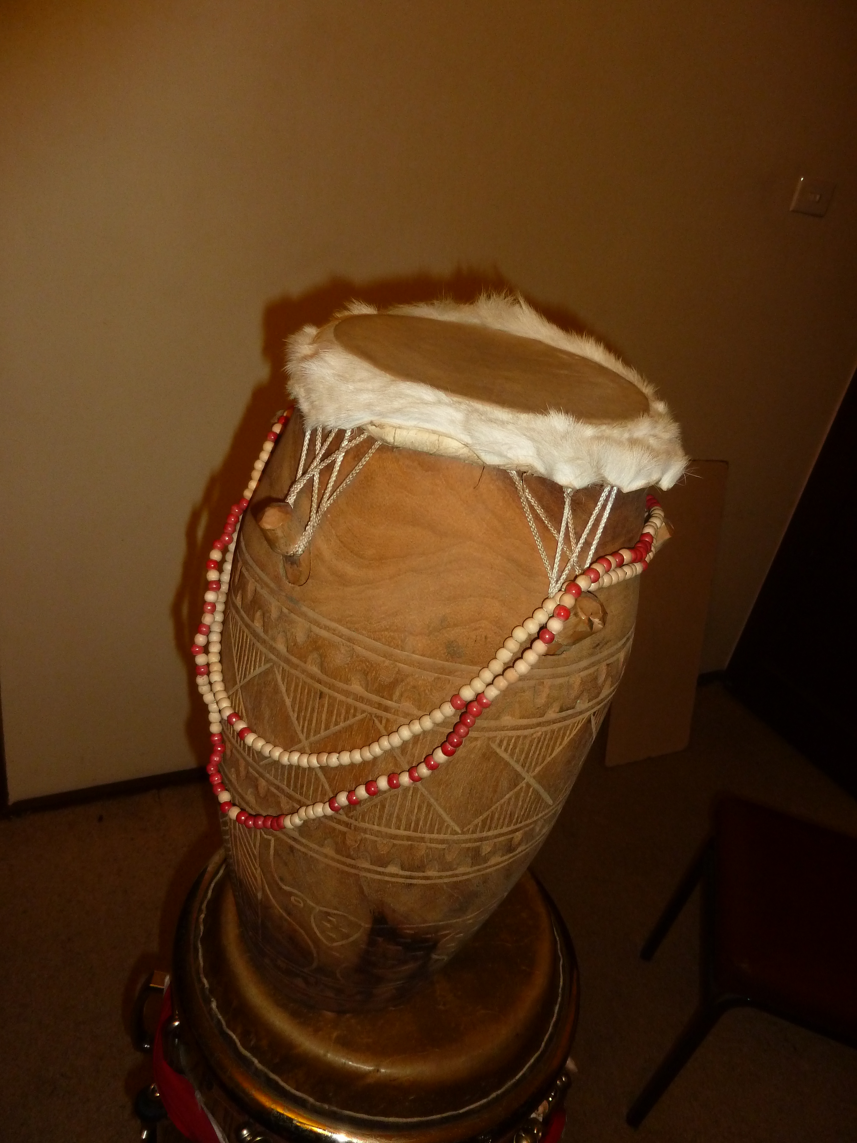 The atabaques that i made and use, both with goat skin, ivory coast skin on the "le" sized atabaque (small, Hammer tuned [traditional]), and the Mali skin on the "Rum-Pi" sized (medium, mali weave).