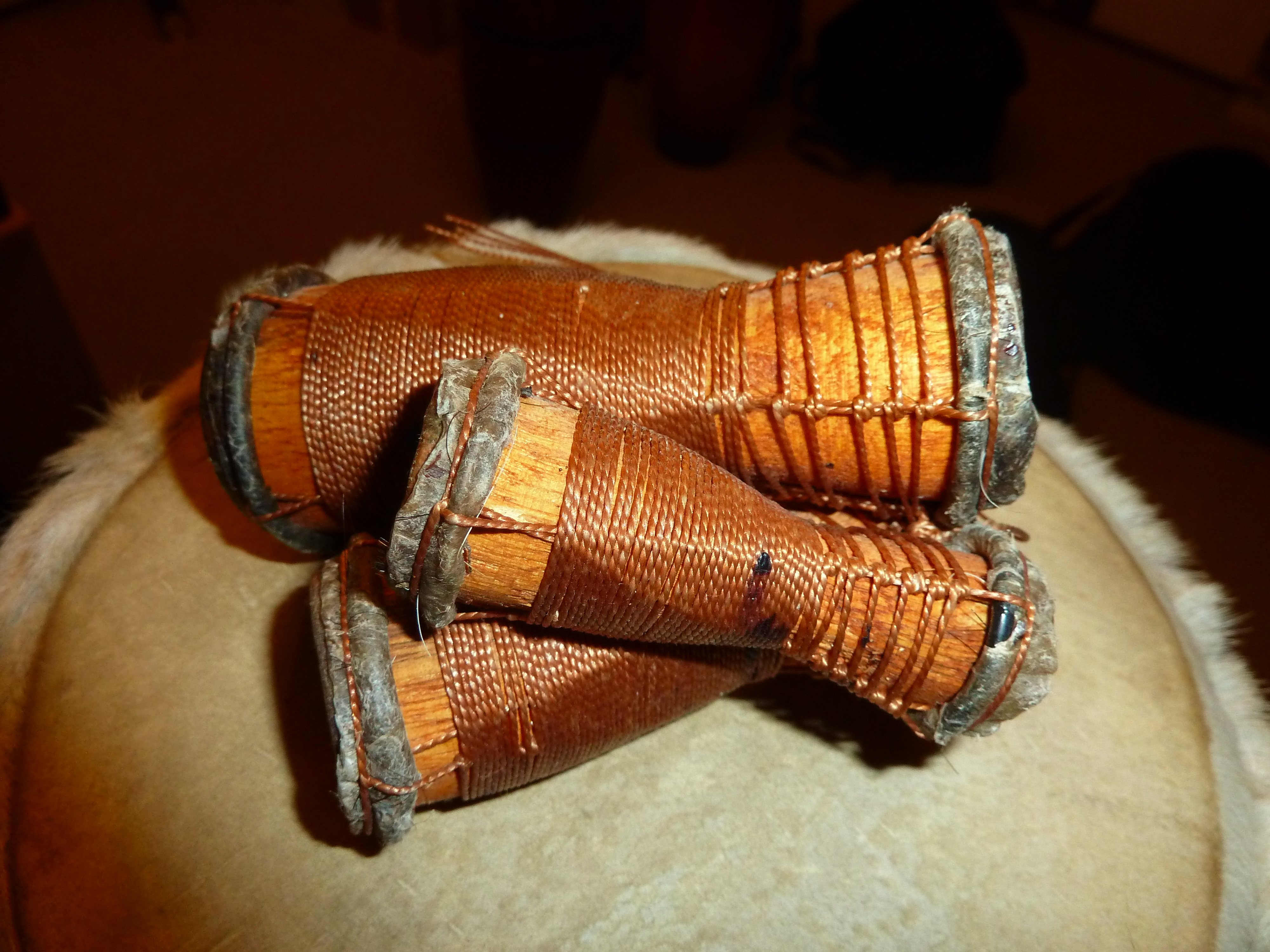 The atabaques that i made and use, both with goat skin, ivory coast skin on the "le" sized atabaque (small, Hammer tuned [traditional]), and the Mali skin on the "Rum-Pi" sized (medium, mali weave).