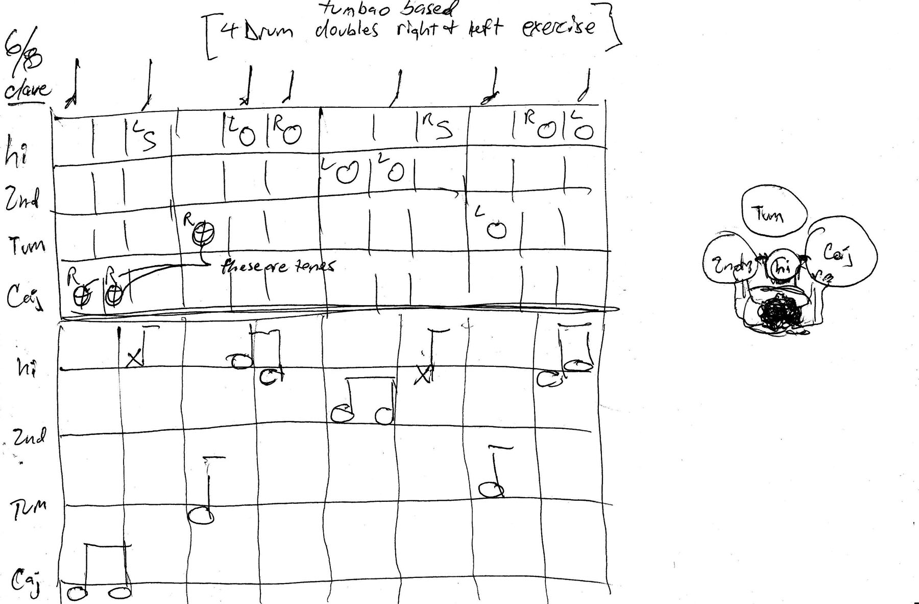 Here's a 6-8 4 drum exercise I just made up last night during a long brainstorming practice. If anyone's practicing movement and doubles with multiple drums, you might like this one. It's sort of a tumbao.