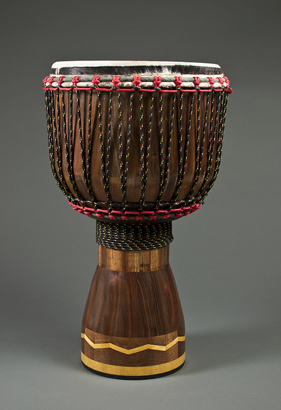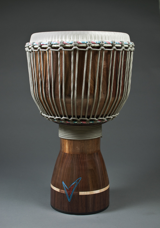 Rest assured that the form of this drum was developed over tons of trial and error while attaining to achieve the best content. In form is function, and this shape is just that. The larger bowl gives for more dynamic range of sound and the down tube shape aids in greater projection and allows me to control the amount of bass. I didn't build these to be pretty, but they formed this way over years of asking myself how to get a djembe with a crisp sound and wide dynamic range and sound more like an African djembe.