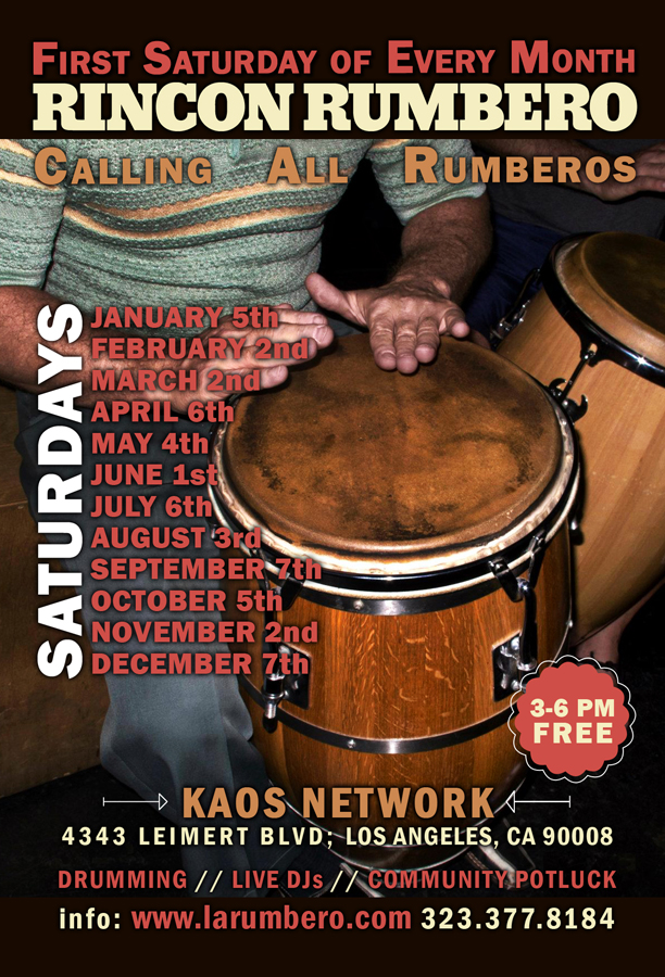 Rincon Rumbero, Los Angeles’ only free and open Afro-Cuban rumba, returns on Saturday, October 6th, 2012 at the KAOS Network in Leimert Park, California.