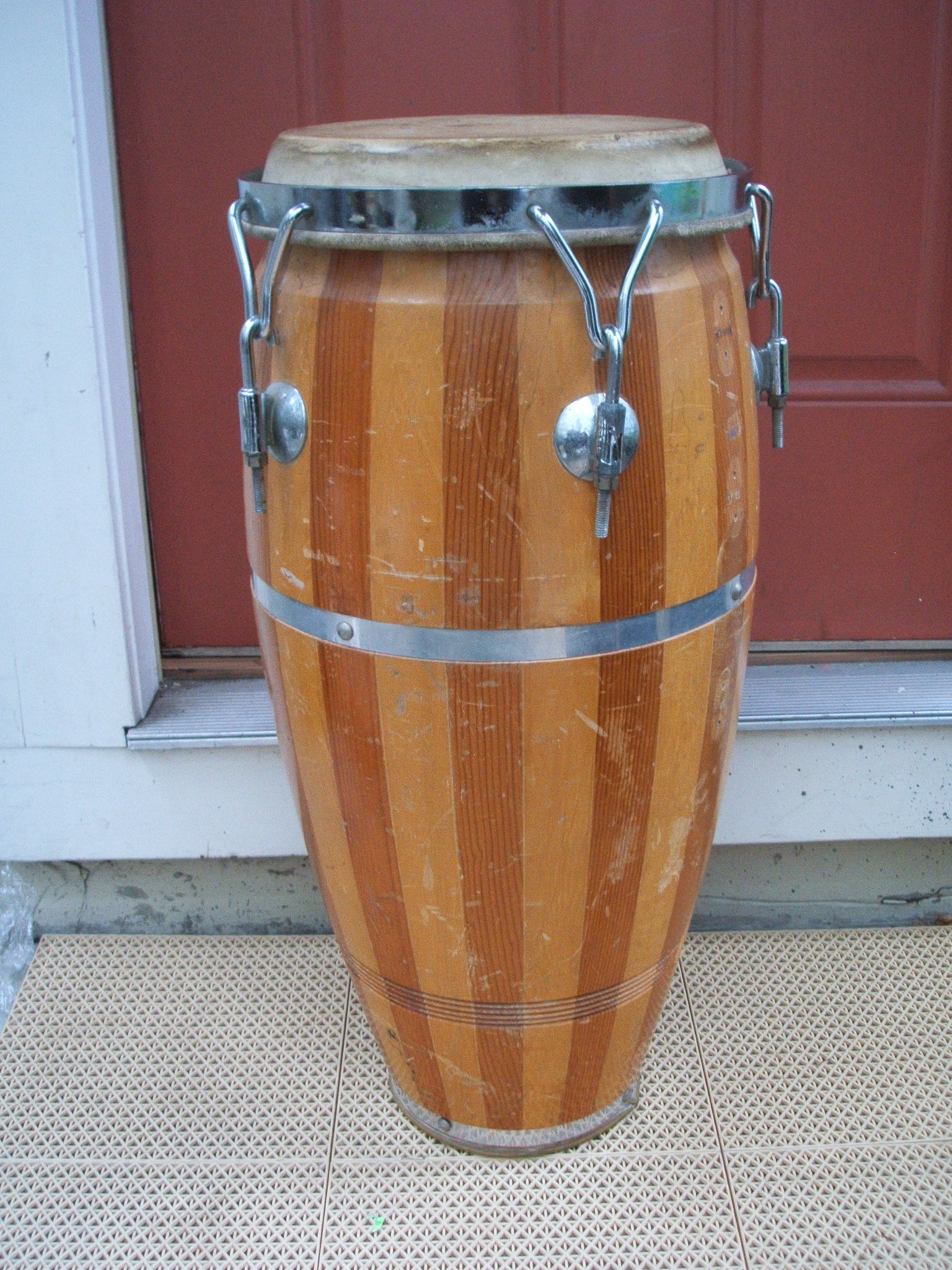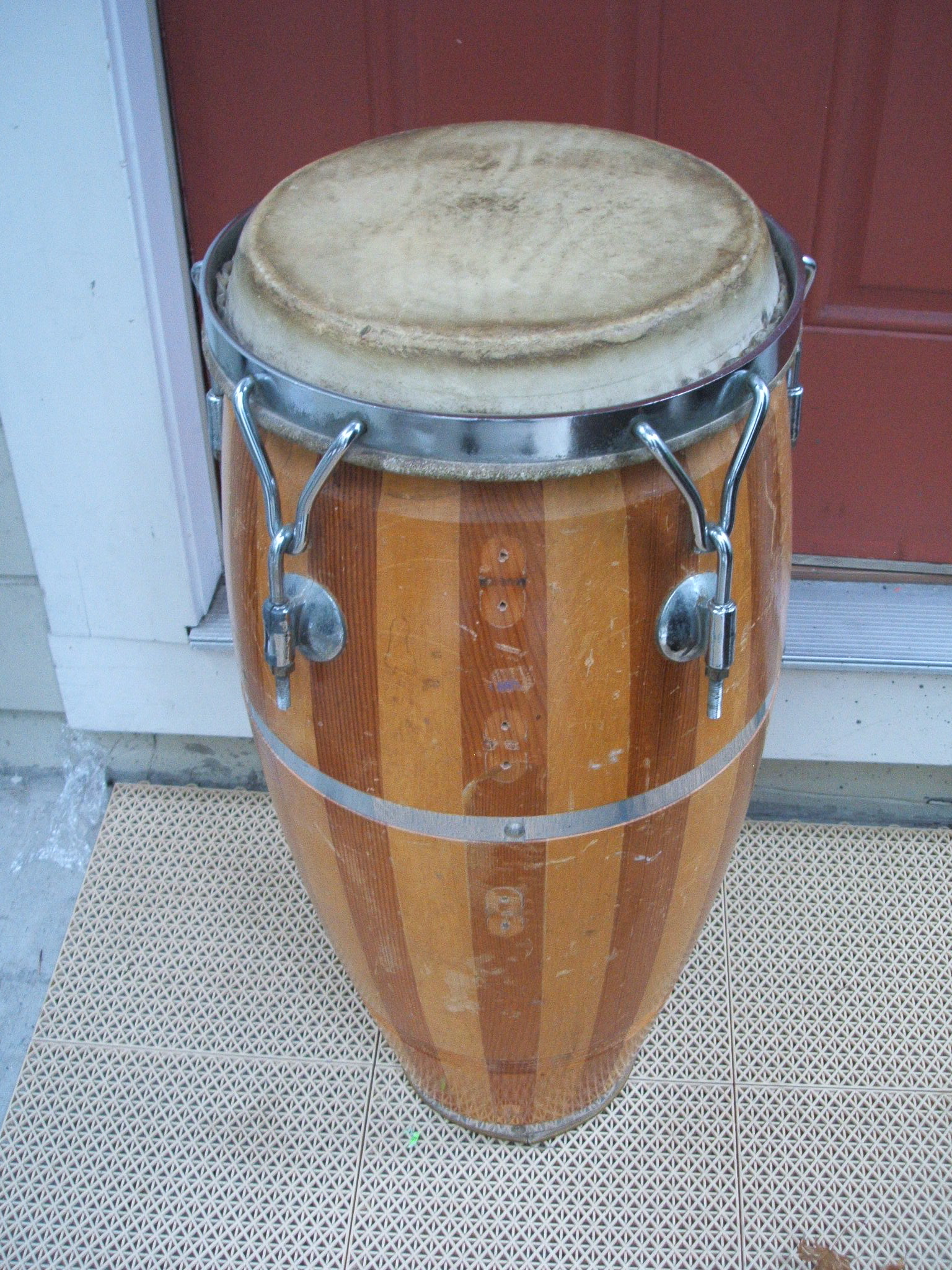Here we have one La Playa conga in good condition. Plenty of scuffs and scratches, but no cracks or repairs needed. I am sure this drum would clean up very nicely. I've played it plenty, it's a great park drum and has a nice sound and volume for rumba with the current skin.