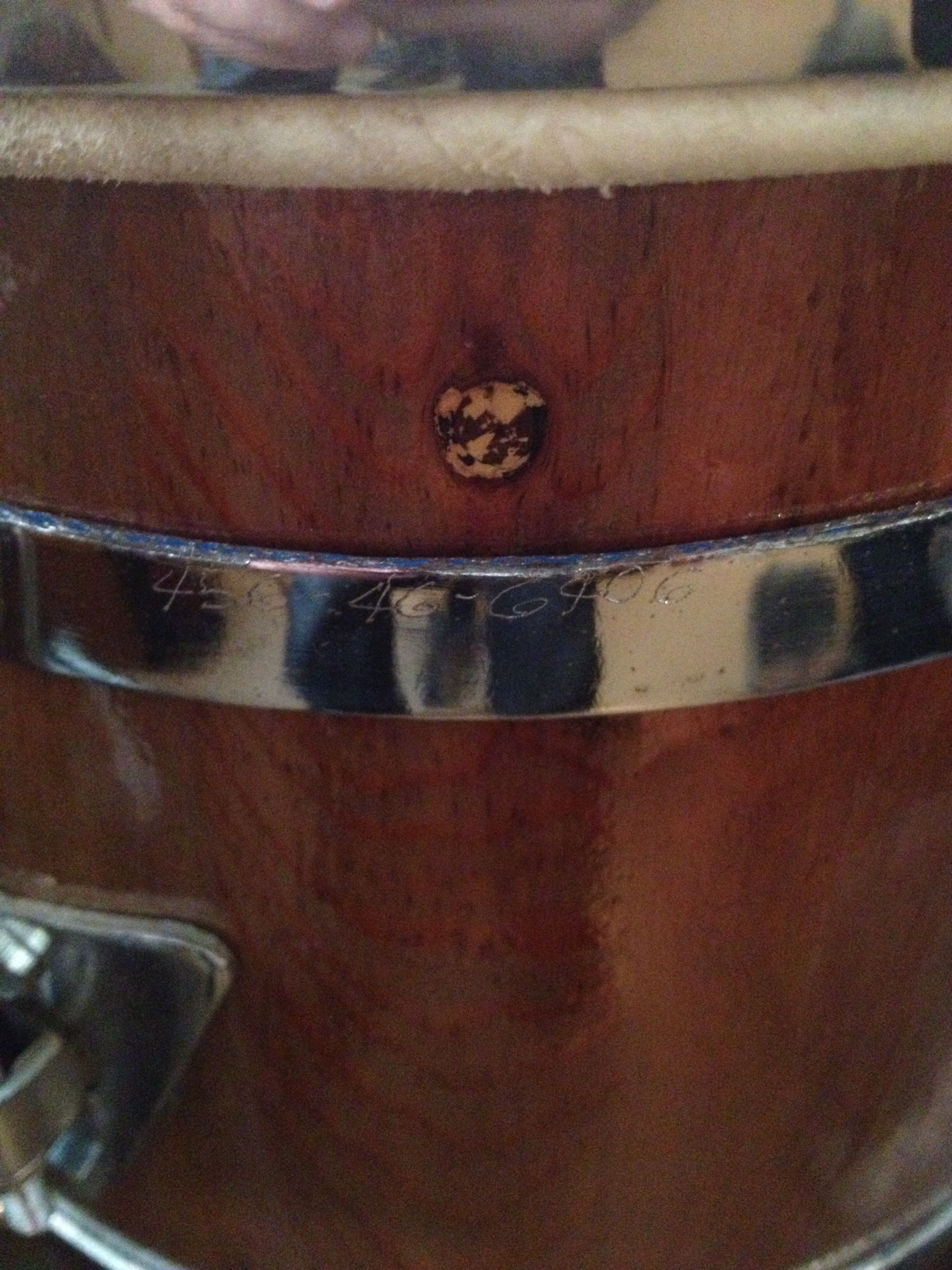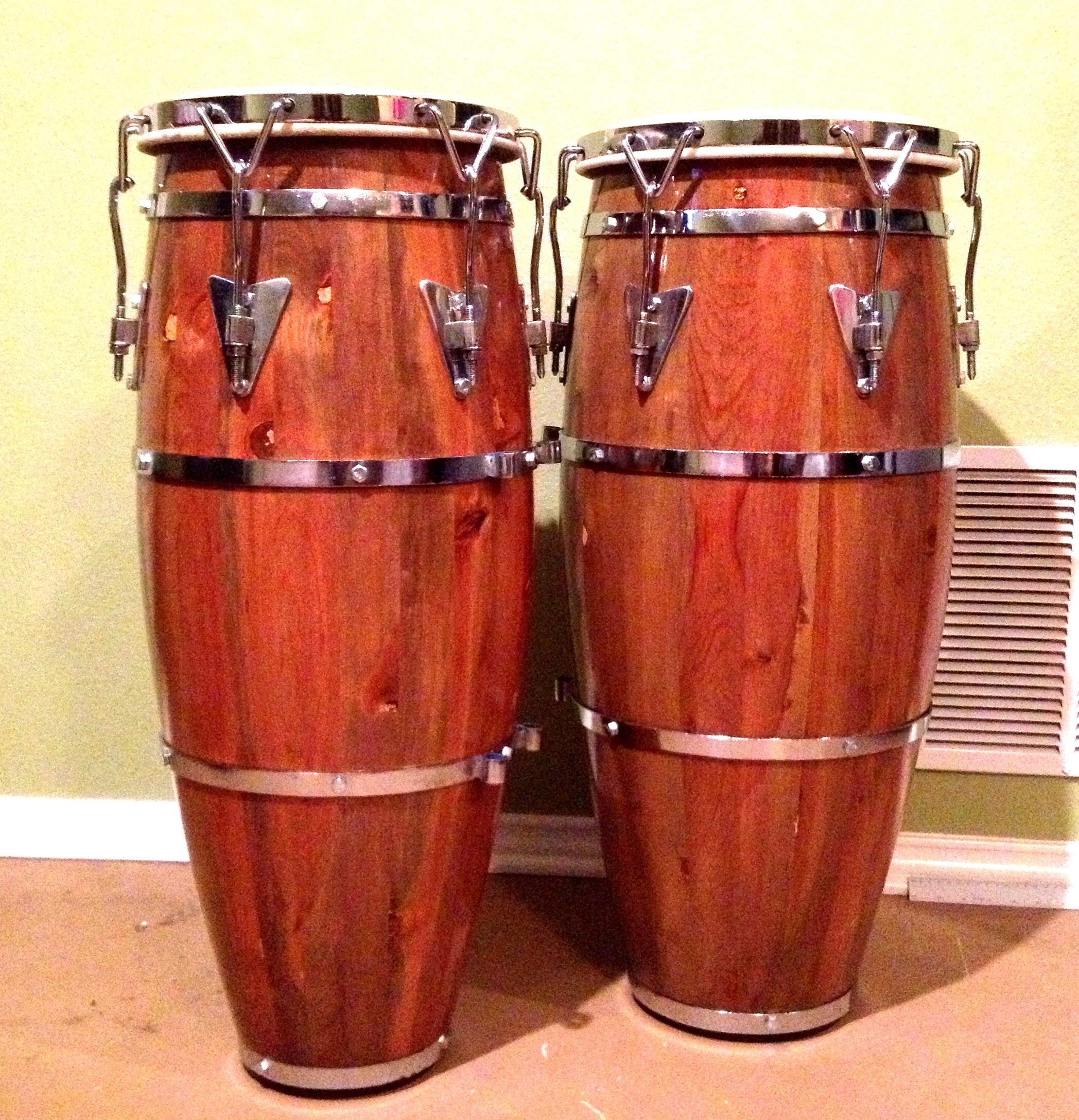 Recently bought these on Craigslist, these congas are monsters! very heavy! I refinished them as you can see. The paint job was pretty bad. I'm really trying to find out any info I can on these. Anything helps! attached is a picture of the inside of the conga, looks like some sort of signature. Also, there is a number engraved on one of the chrome hoops (456-46-6406), have no idea what its there for. If anyone has a conga with the same signiture or numbers in the same area maybe you can give me info of the history!? Thank you all so much my fellow congueros!