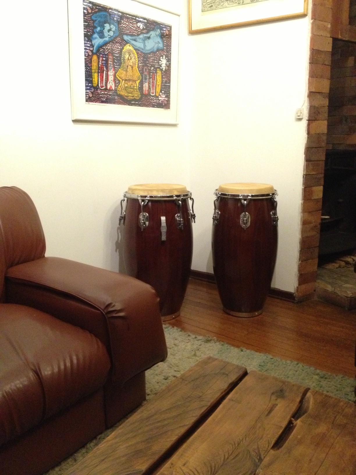 The painter suggested that he BURN the conga to match the color of the tumba, because the two drums were of different tones.