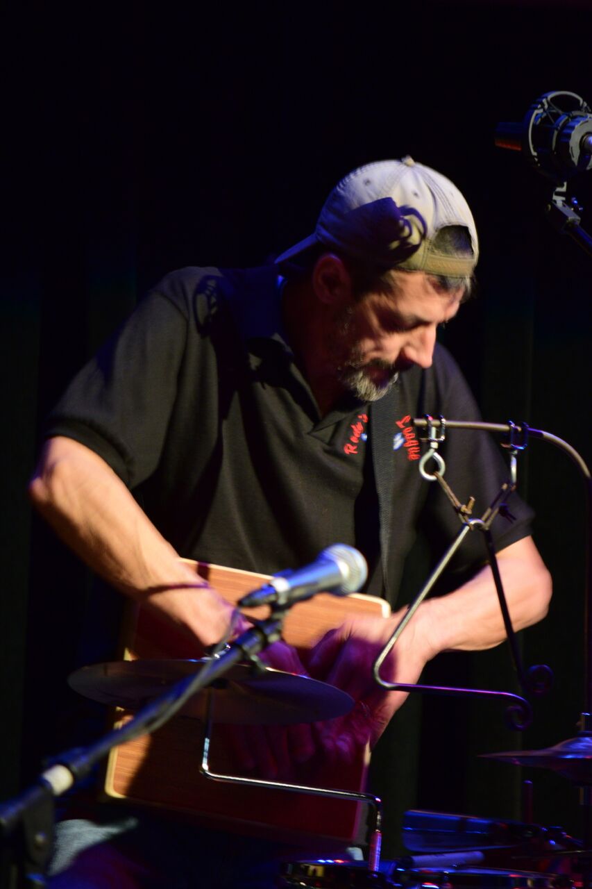 ostensibly a bluegrass band ... instrument-wise ... and I know full well that there are purists who do not think percussion belongs in bluegrass. Plus, the traditional Monroe-style arrangement has the guitar and mandolin more or less substituting for a drum set, so finding practical and interesting ways to add percussion can be a fun challenge. When they first invited to join, 5 years ago, the idea was that I would do my "hillbilly percussion" thing : spoons, minstrel bones, washboard, jews harp. (Modesty aside, I am very adept at those instruments, having been at it since I was a kid.)