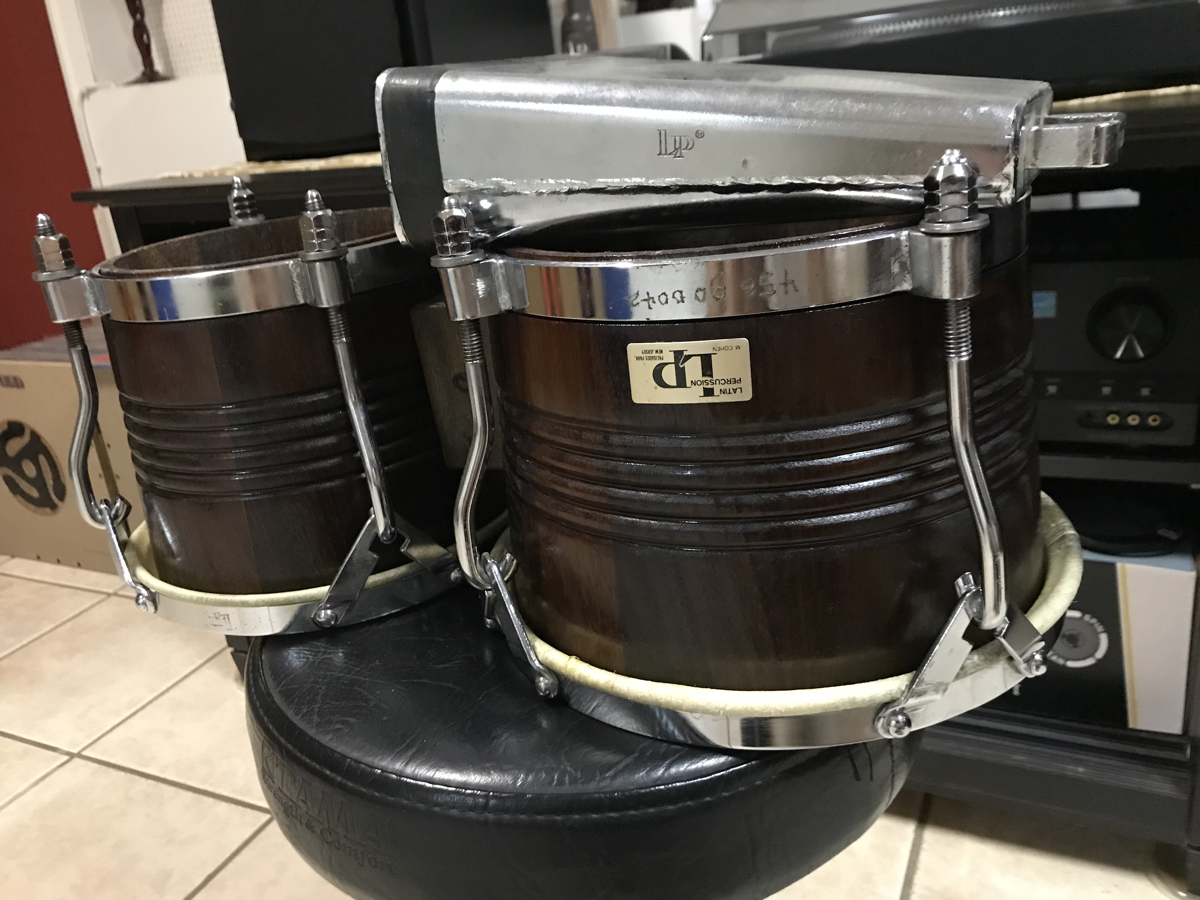 Bongoceros! This is what everyone played in the Salsa and Guaguanco scene in the 70’s. I’ve owned this LP Bongo Cowbel for over 35yrs now. Got it from a guy who got frustrated with it because he couldn’t get it mounted in his Timbales. So during a gig he one year he tells me “La quieres” and of course I said “Yes” lol. True old school sound on this bell. The Bongos I got from a Guy in LA who thought it was a good idea to engrave his name and what it looks to be his SS# on the rims. What a dope! The guy didn’t even know what he had. These are late 60’s or early 70’s Palisades Park with Cuban bottoms and made out of Dark Walnut. Super light.