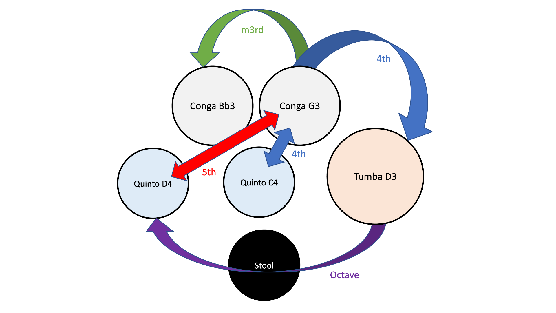 2. Is probably the most common method used by more experienced conga players. This involves tuning the drums so that the musical interval between them is e.g. a perfect fourth or a fifth apart. This is often done by singing a familiar tune or matching the pitch of the drums to notes played on a piano. In most scenarios this works well and makes sense if you are using traditional rawhide heads, because the pitch of the drums may well change during your performance if the temperature and/or humidity levels change. In theory if the heads are of a similar type and thickness they should expand or contract at a similar rate so that although the actual pitches are changing the intervals between the drums should stay roughly the same. The downside to this is that the way your drums sound will change from session to session and it won’t be easy to reproduce a specific pitch/sound if required.