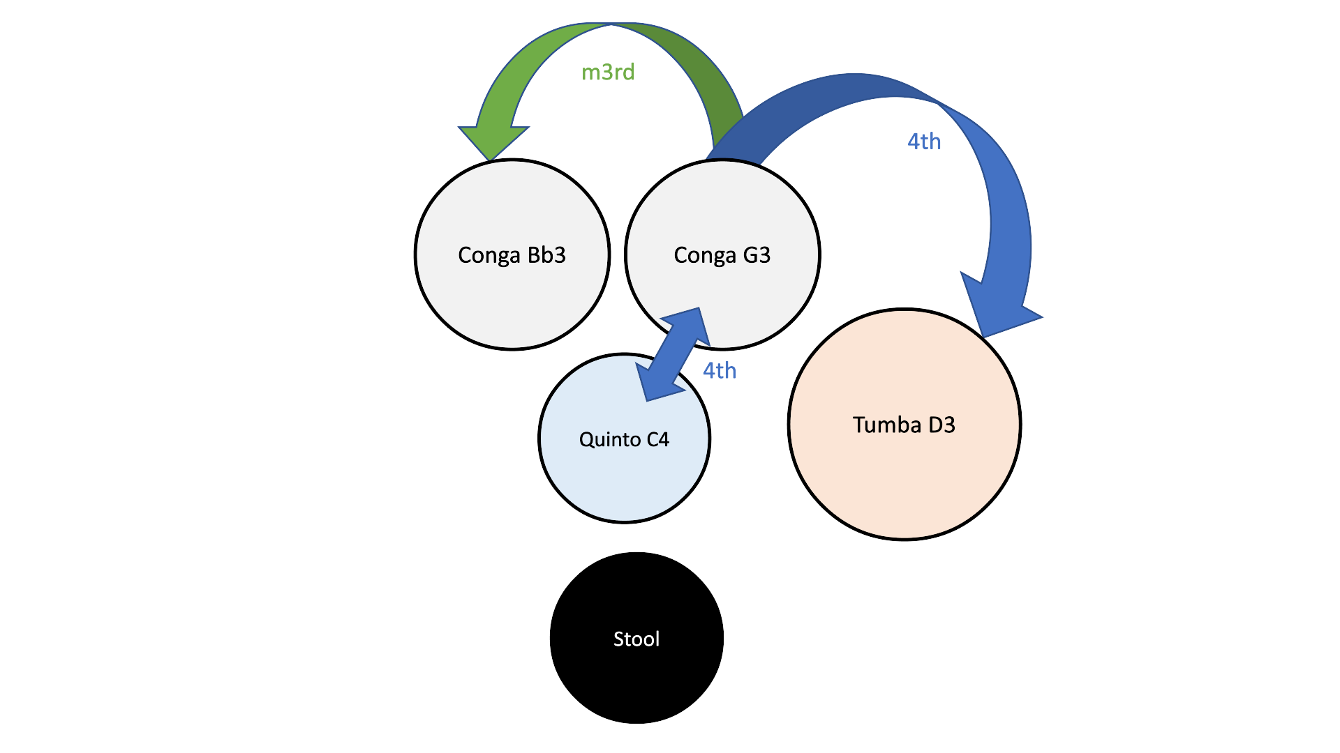 These are the tunings of my 6 drum & bongos setup. These pitches work well for the individual drums in terms of pitch and resonance, and they provide a variety of useful intervals which are vital for reproducing common rhythms and voicings. This setup provides three perfect 4th intervals between different pairs of congas as well as on the bongos. There are also two 5th intervals and two minor 3rds. This allows me to play traditional latin rhythms as well a jazz/fusion and pop/rock music using different combinations of drums. It is important to point out that I would rarely use more than three drums whilst playing an individual tune, but this setup allows me to switch to a different set of three for each tune depending which pitches/notes work best. In reality it isn’t practical to take this many drums to a gig or recording session in terms of transport and/or room on the stage/recording studio unless you are a top line professional with the relevant transport/support. I have found that for smaller gigs and/or jam sessions just taking the Roland HPD20 and plugging it into the PA system gives me access to six drums & bongos, without the mic’ing/feedback issues and the added advantage of being small, portable and giving me the ability to shift the pitch of all of the drums up or down a semi-tone or two between songs. But it isn’t as much fun to play. So here are some smaller combinations to try...