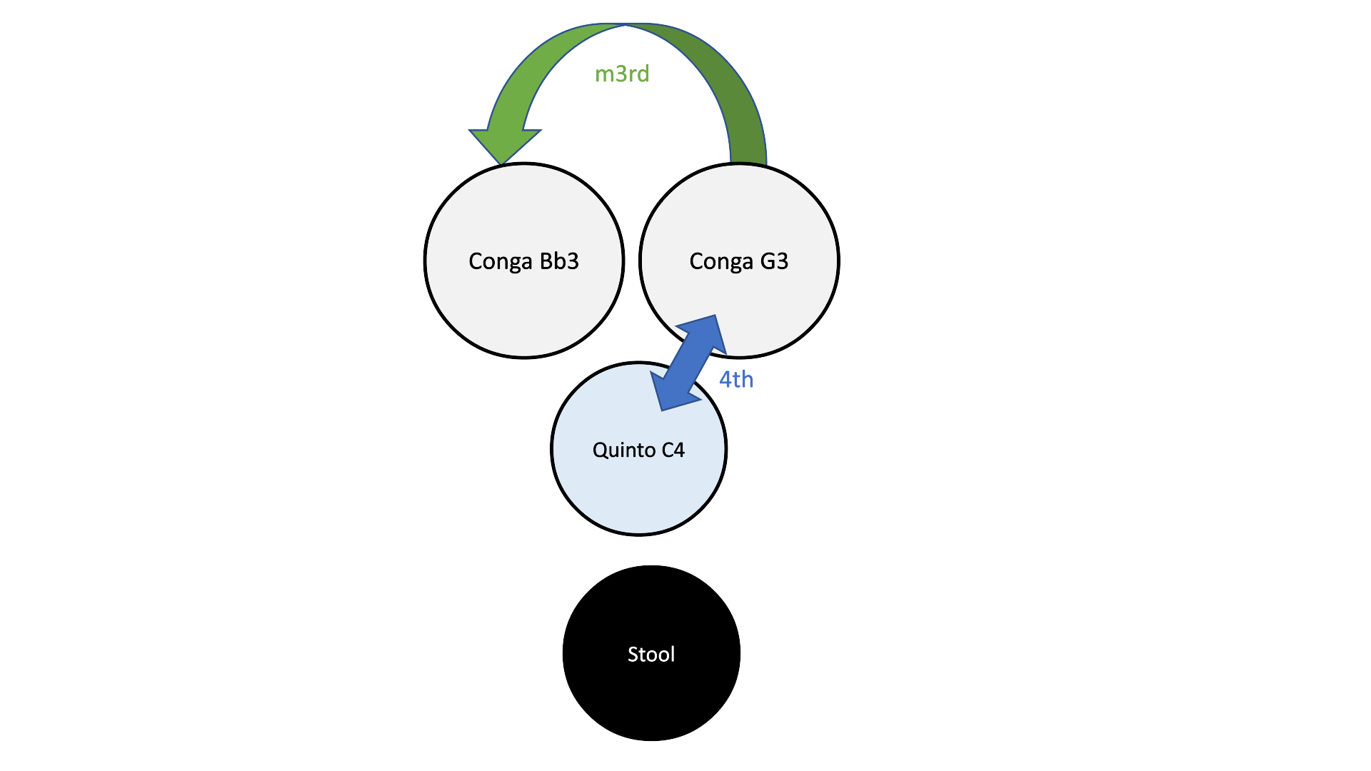 3. Is the method used by most professional congas players. This has been true for many years, however with the development of synthetic conga heads it makes a lot more sense for all players to consider. Tuning to a specific set of notes allows you to reproduce the same pitches/sounds every time you play and if you are using synthetic heads they will generally stay in tune once they are worn in, as they are generally unaffected by temperature and humidity. Rawhide heads do sound better in my opinion, but with each new generation of synthetic heads the difference gets smaller and in combination with their tuning stability I think they are the best choice, although they are still ridiculously expensive because of the smaller turnover compared to drumkit heads. Most professional have their own preferred set of notes and if you read the article I referenced above you will see there is no standard tuning which the majority of players use. They each have their own preferences which gives their playing a unique pitch and sound.