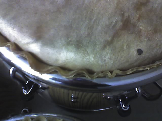 I tiranti erano strinti allo stesso modo,le pelli le ho accordate quando ormai asciutte,le ho lasciate a mollo anche 3 giorni perche' fossero il piu' morbide possibile.Non vi erano risvolti"sovrapposti" all'interno del cerchio.Montarla sulla conga e' stata un'impresa,a causa del cerchio comfort ( le pelli precedenti erano poco piu' di 2 mm).