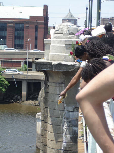 Oriki, (songs) are sung in a particular order with the BATA, special two headed drums used only for special occasions. Once the processional reaches the bridge, incantations and prayers are offered in Yoruba. The Priest or Priestess ask OSHUN if our offerings are acceptable. Once a positive response is interpreted participants are given instructions to make their offerings.