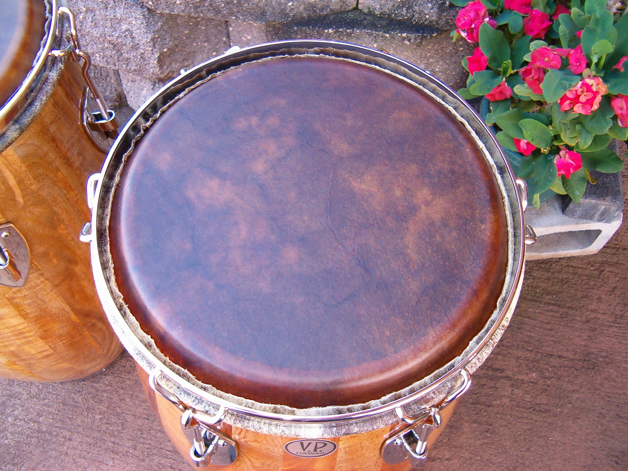 I recently mounted three of them fabulous dark steerhides on my set I got from Tom at VP and yes, everything good said about them are the TRUTH! I got Med/Thick heads and the bass,open and slaps are MEAN! Attached is a skin I mounted on my Conga.