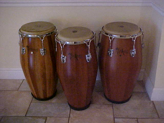 I'm selling these for my friend Raul. He suffered a lower back accident a few years ago and has not fully recovered. He bought them to learn but has not been able to because of the accident. They haven't been played, are in excellent condition and are truly a work of art, the cherry wood is absolutely beautiful. I tuned them yesterday and play them for awhile, they sound incredible. I'm not in the market for congas now, these are the most collectible out of the LP stable,on account of the cherry wood. They were only made for a limited time and they are almost impossible to find. Sizes are 11, 11 3/4 and 12 1/2. Collectors items for sure. He wants only $1,200 for them, I think that price is a bargain for these beauties. Email me if interested.