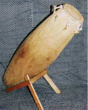 The atesimevu is usually played with a stick and hand technique with the drum on an angle to let the sound out. If you want to learn that style you would make a stand that would hold it on an angle like that and get yourself a thin branch of tough flexible wood that would stand up to the punishment of being whipped against the skin on the drum and also getting whacked on the side of the drum too. This drum typically uses antelope skin because it has a bouncy quality to it.