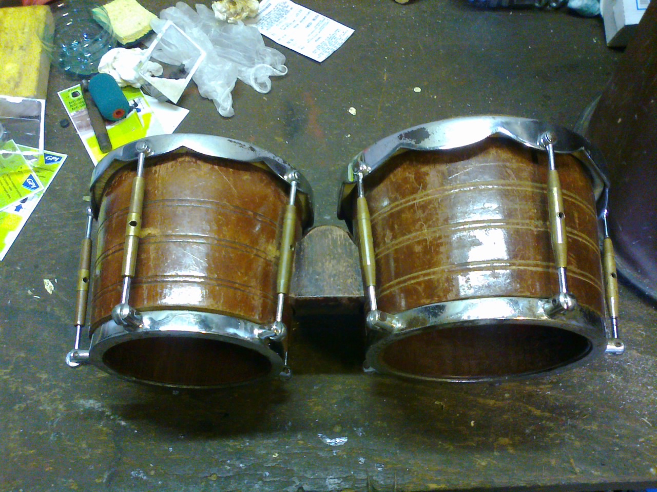 Looks like the person or maker used two crowns on one drum with a turnbuckle like part in the center. Very interesting. I am wondering if you can see any signs of wear of scraping along the lower crown? That would be one of my main concerns with those drums. The bongos however look like they have no such issues.