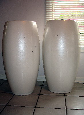 Here are some photos of my Slingerland Congas that I have decided to restore. I have taken all the hardware off. I need to polish the chrome. I have fixed the fiberglass shells with a fiberglass filler. I have sanded the shells smooth. I have to tape up the bottoms and then they will be ready for the painter. I was thinking White with metal flake or white pearl. I will keep everyone posted on this project. Enjoy the photos.