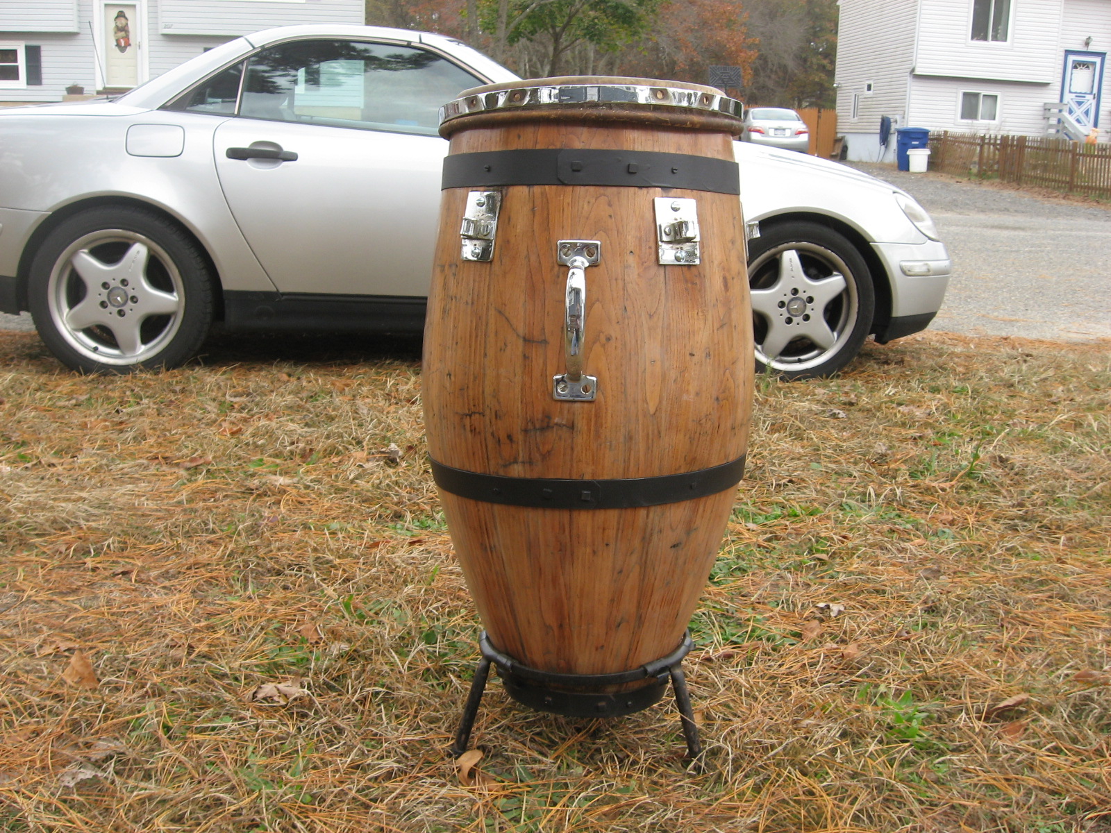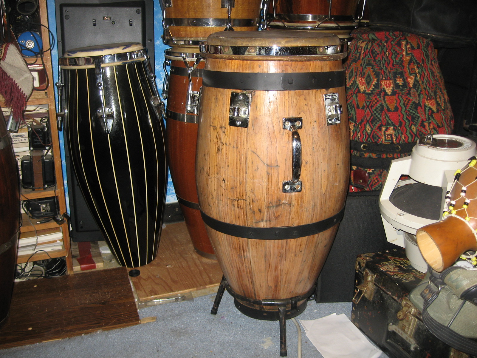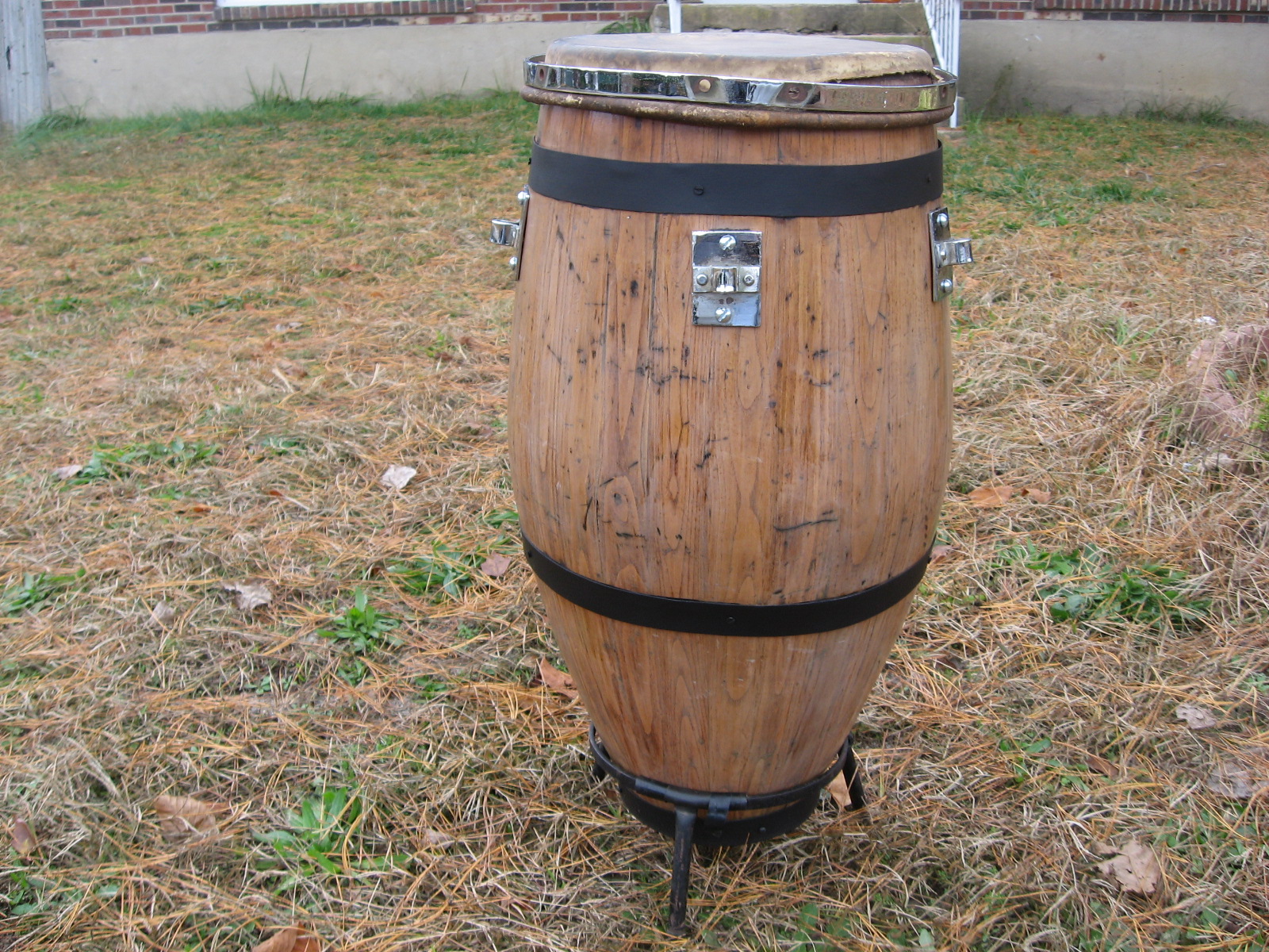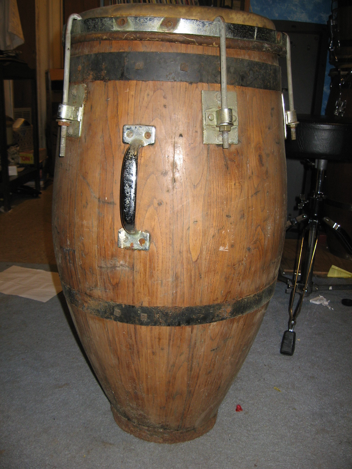 You have heard Cuco mention as well as others that Junior had made some drums from old barrels he got from the Brooklyn Navy Yard not far from were he lived. These were among his first drums very early, the barrels were made of Oak as most barrels were. Some barrels were to keep wine some beer but most at the Yard were used to store hardware in such as nails, screws, washers, and that sort. Well guess what I found when I came home from work waiting for me. Yep I got lucky, it in rough shape and will need restoration but I belive she is a diamond in the rough. Some idiot cut the loops of the crown and theres rust and stains all over but nothing that Matthew or Cali cant fix. Im not sure the barrel bands are original but theres no evidence that there ever was any other bands on her. I'm going to clean her up and see whats up. Its a 12" head. I just wanted to share my good fortune with everyone here on the forum.