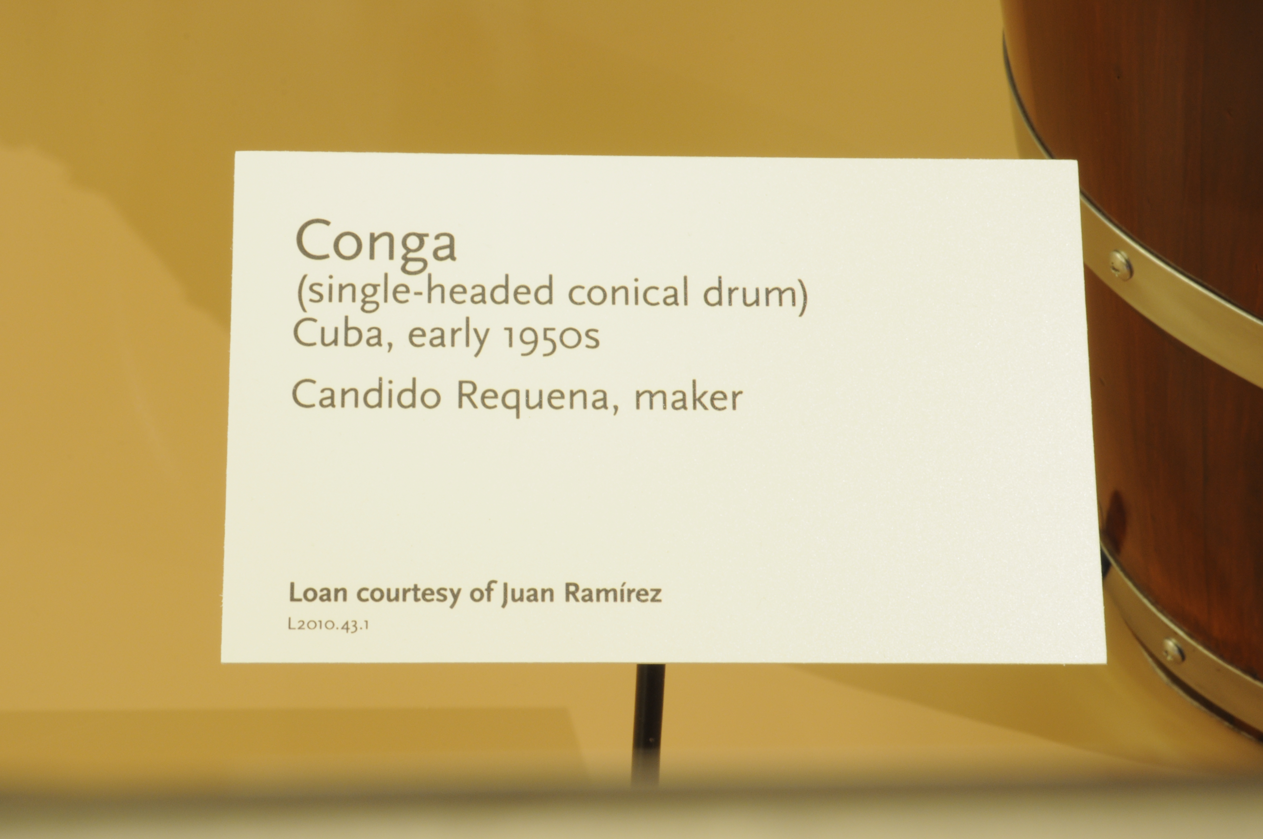 "You may know that we’ve currently been through some Staff transitions in the Latin America (and other) sections, also that we are in a process of re-defining displays and working on a reinstallation of parts of the Latin American gallery. That includes Cuba which will have more space allotted to it, given the importance of its musical traditions and influence throughout the Caribbean and beyond (US, etc.). As it stands, the galleries will probably be reinstalled sometime after this summer at which time I intend to include your loan in the display. I enjoy the quality of the instrument and plan to present it properly. In the meantime, as the gallery is in such a transitional mode, the conga will need to remain secured in our storage. Once on display I would hope you’d be willing to extend the loan if possible. Other than sharing the status of your loan I also intend this as an introduction and hope you feel free to contact me in the future if you have any questions or plan to visit MIM at some point. Thank you for your support of MIM and hope to meet sometime soon. Best regards, Manuel"