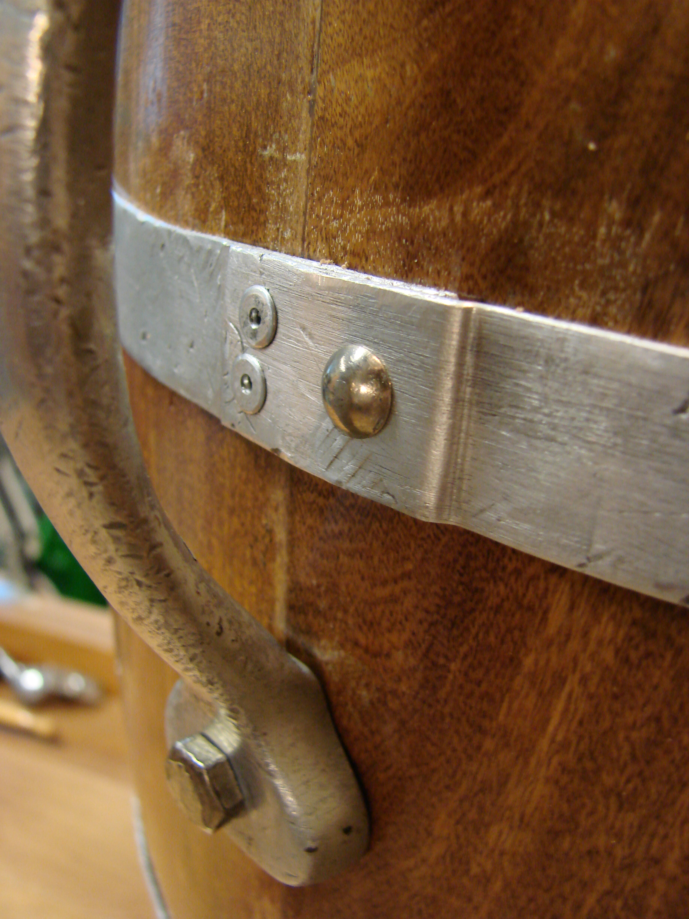 It's actually a dead on 11" Tumbadora and not 101/2" as i previously stated. I guess my measurement was thrown off by the inconsistancies due to its miserable original condition. The Aluminum bands had all stretched a bit over time due to the splits in the staves and wood movement. So, I had to cut and rivet one of them to accomodate an even spacing when reattaching them. Intersting thing about these bands; I couldn't find a single weld seam in them. My only guess is that they were cut from high end Aluminum tubing. All the hardware is original with the exception of the washers for the plate lugs and as I mentioned, I'm making new Tuning lugs from material I already have around. For what it's worth, to date I've spent a total of 2,85 Euros on this project. I thought I had lost a couple of the upholstery nails for the bands, but then I found them after I took these photos.