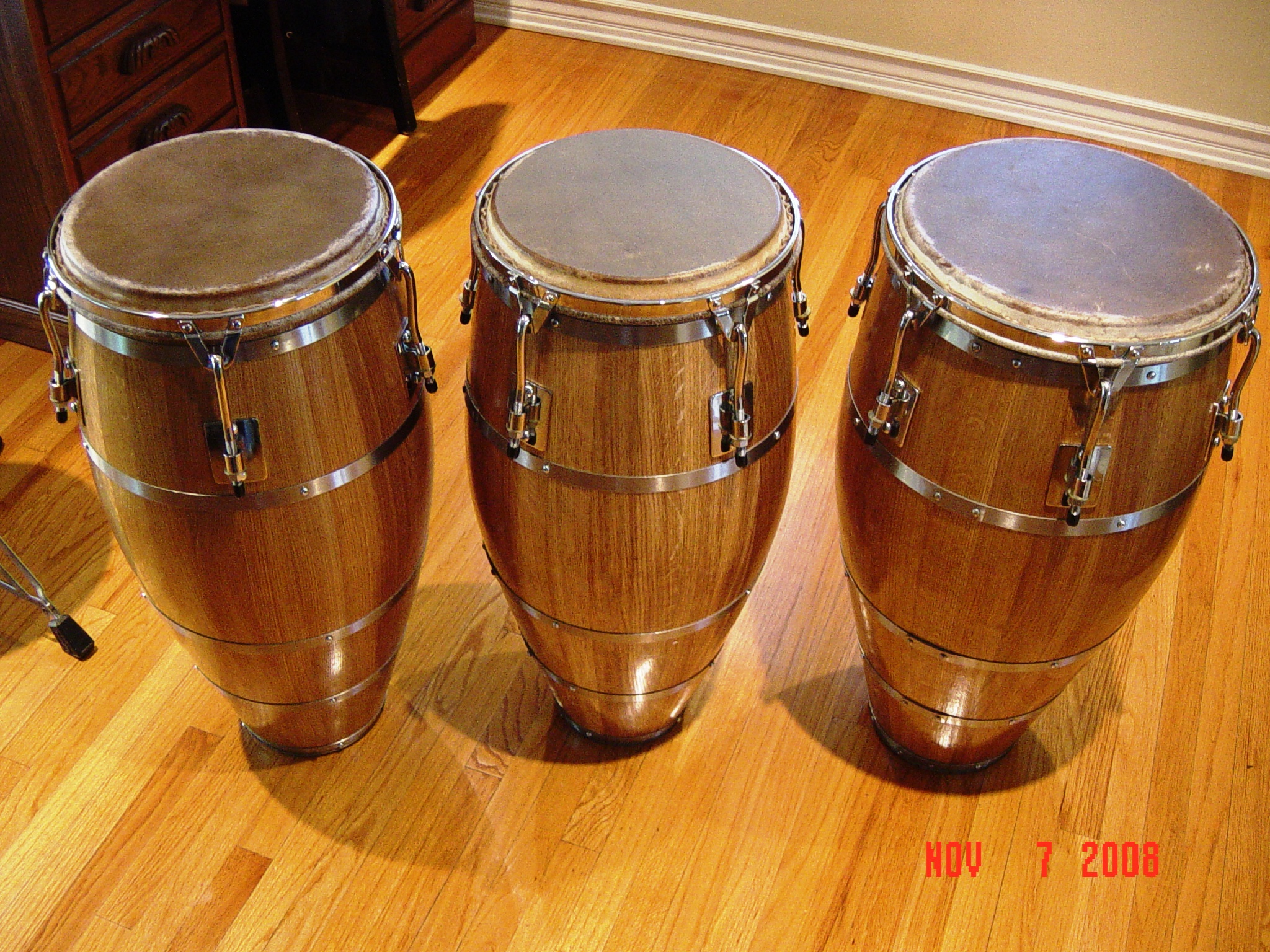 I believe the difference comes from the fact that I have hardwood floors throughout the my house, this produce’s an echo sound affect, what doesn’t help is the drum’s being very to close to the wall, at church it's very open and the drums are on Gibraltar floor stands which rest on carpet and like I mentioned, in this setting the sound is incredibly good. This is the case with my other set of Congas, at home they sound just a little ringi, echoi, for lack of better word, but they sound great in the open. Hope that helps.