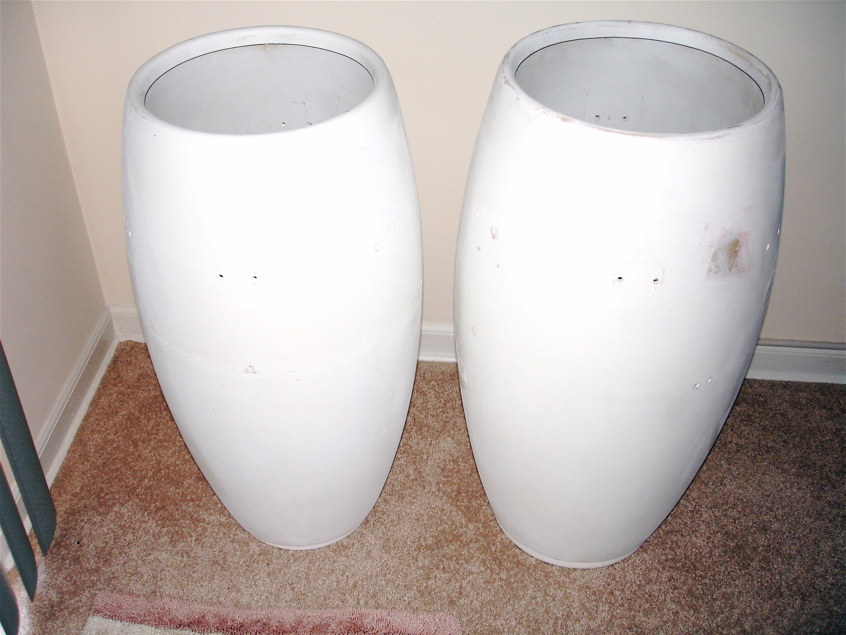 Here are some photos of my Slingerland Congas that I have decided to restore. I have taken all the hardware off. I need to polish the chrome. I have fixed the fiberglass shells with a fiberglass filler. I have sanded the shells smooth. I have to tape up the bottoms and then they will be ready for the painter. I was thinking White with metal flake or white pearl. I will keep everyone posted on this project. Enjoy the photos.