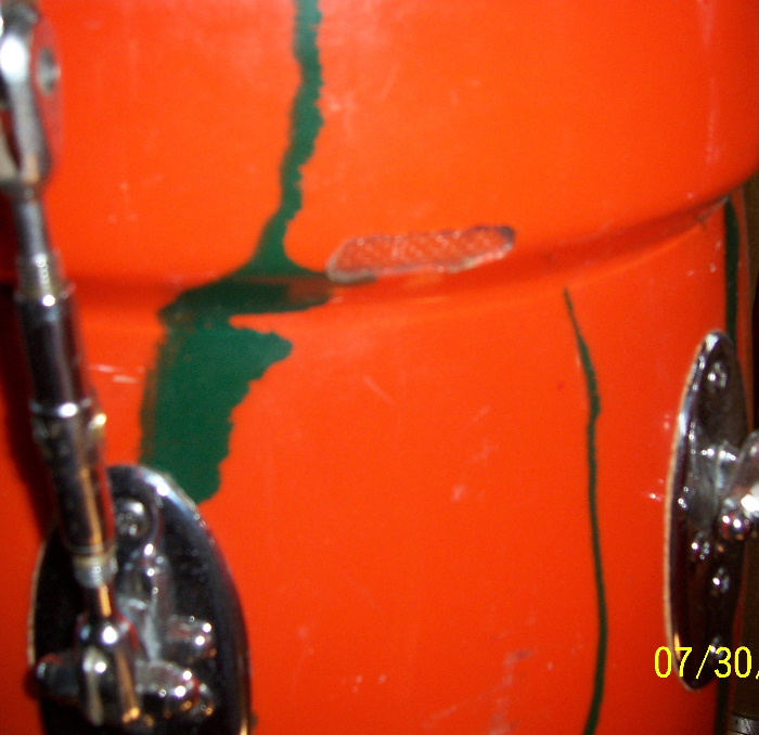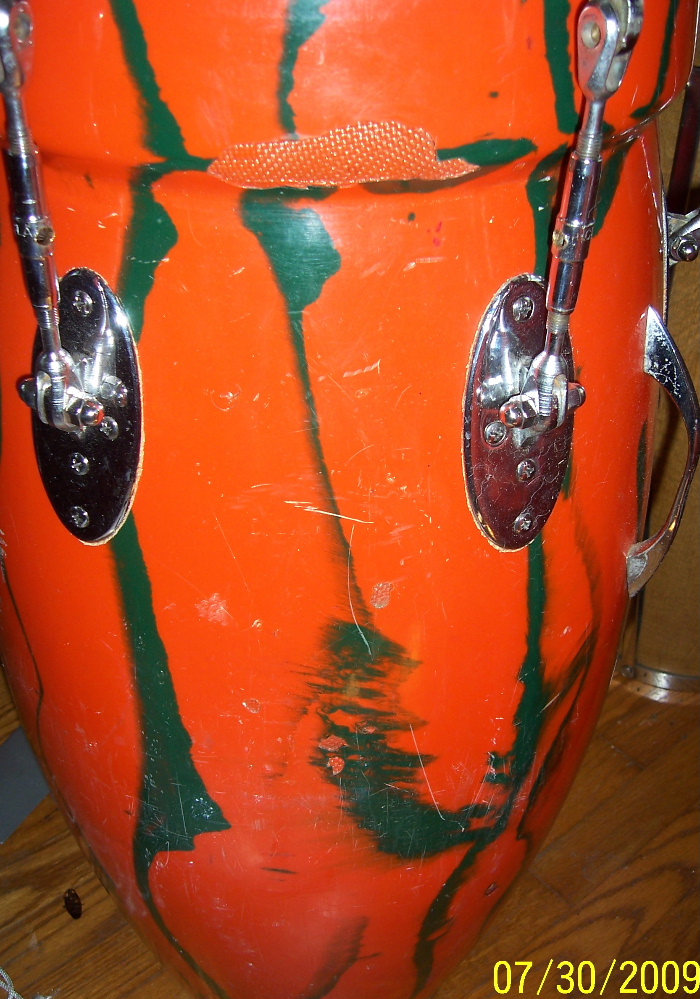 Here ya' go, Tonio. I pulled the head off the tumba to check something. The chrome is decent for the age, I replaced all of the sideplate screws and acorn nuts with stainless. I cleaned up the shell with Penetrol but, there are lots of small scratches. As the pics show, there are some gelcoat voids that look like original defects since the color goes all of the way through. I decided not to fix them due to; gelcoat has very little strength and, the repairs would show and I'd have to paint the whole drum. the quinto has none of the gelcoat voids, just lots of small scratches. There is one spot that looks like someone tried to touch up. It has a Bill Confer head and sounds awe