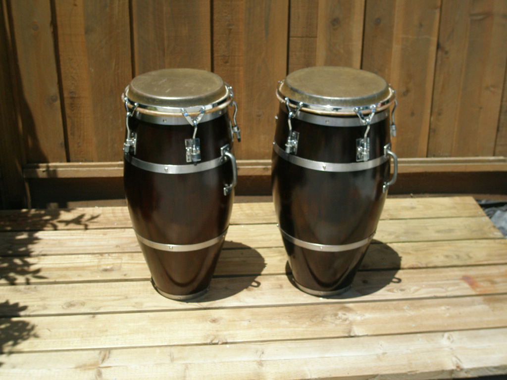 hereTumba is an LP Classic as it came from the factory. Segundo and quinto are fiberglassed oak Gon Bops with Buffalo/American Bison heads. I think that they are just a little livelier than similar GBs and prefer them over my LP Classic segundo and Tocal LE quinto, although I'd probably go with that set-up for a more heavily amplified or rock type gig.. The tumba is a bit unmatched in sound and finding a matching GB tumba would make me very happy.
