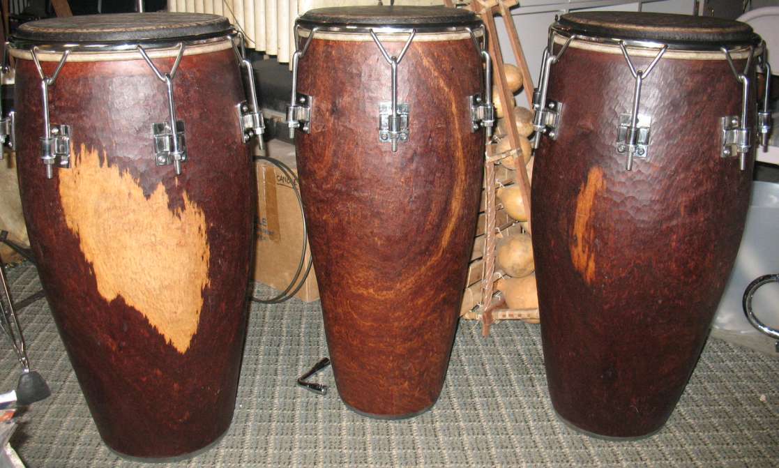 I just received an awesome set of handcarved Hare wood (West African) congas. While the set is a beautiful sight for the eyes, I was disappointed in the sound. They ring. The heads are American steer. I decided to tackle the quinto first and tried the solution found on Youtube: