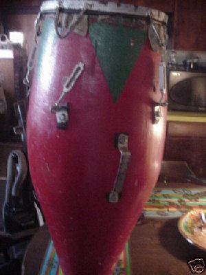 Burke I agree with you I love the art on the drum many here would not appreciate the drum. I look at the shape and think to myself with the proper hardware and skin I bet it would be a fantastic player. Ive puchased some great drums off of ebay because they didn't look correct, well Im glad they didn't cause I was able to get them for alot less. I LIKE IT Very much, good luck with it it has mucho potential. Here is a funky drum before and after photos I also purchased it off of ebay. It was made out of hollowed out solid piece of tree, in 1963 in Branquilla Colombia, The lug plates are SOS, the crown is Gon Bops, head/skin is horse, lugs JCR/Cali.