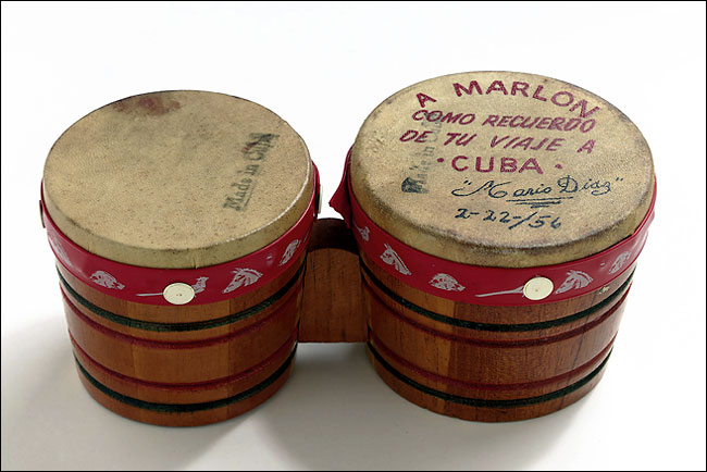 So I just bought Marlon Brando's bongos...well, not his exact pair but a pair that was obviously made by the same people in Cuba. As you can see from the date on Marlons set, they are from the early fifties. The only real difference is that the pair I just bought has a blue band where the head is tacked on, and Marlon's has a red band. My question is, can these be actual players or are they really just souvenirs? I have many bongos from JCR's to Palisades Park LP's, to an old solid shell Cuban set with keys by Jay Bereck, but I've never owned a set of Heat 'em Ups until now...Thanks all!