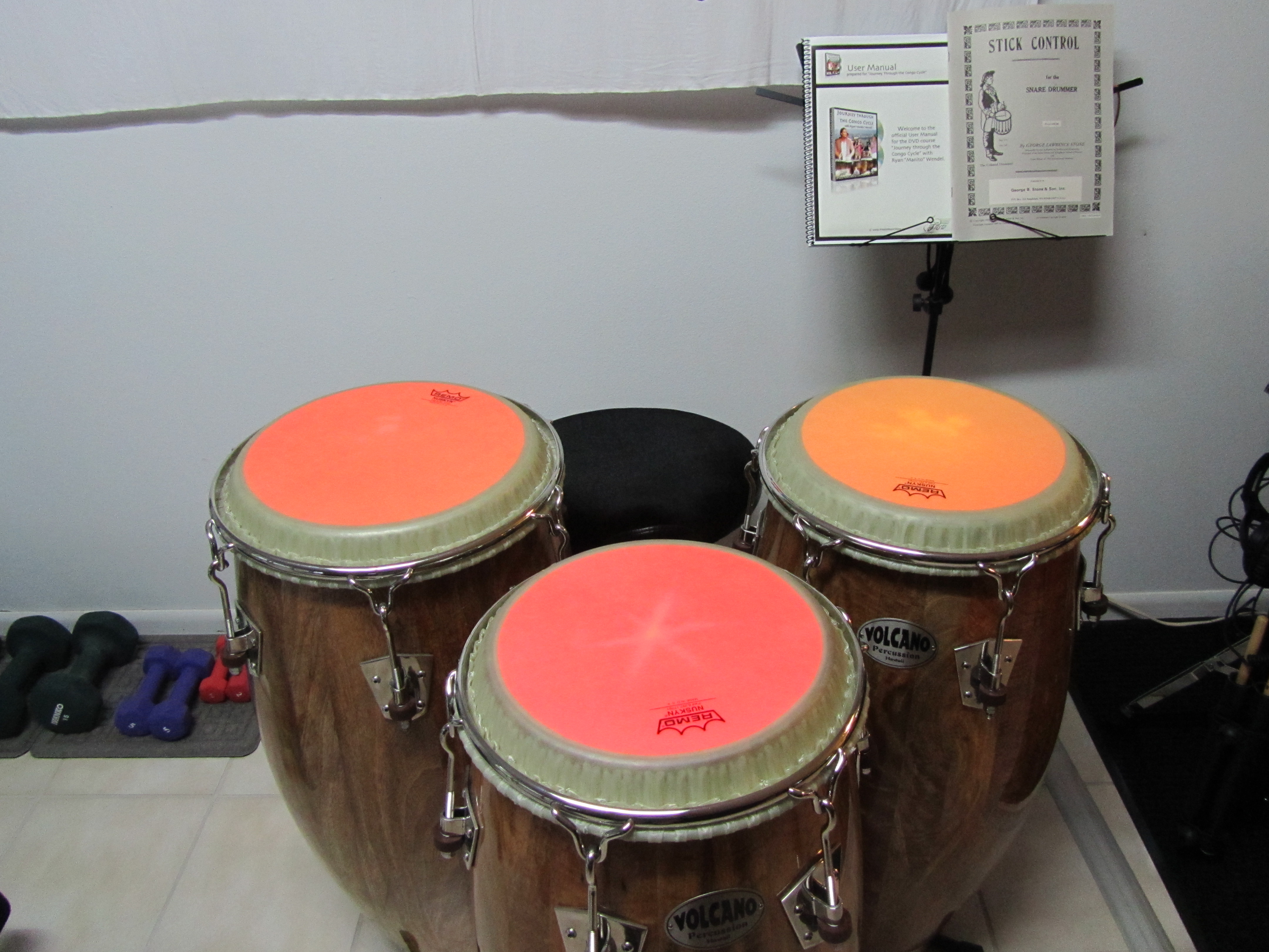 I wanted to share some information on a set of conga stands that I have been testing/using now for quite some time. I am 100% satisfied with them for a number of reasons. These great little stands hold your drum up off the floor just enough to let the bass come out. The stands will protect any floor you play on. They are super light weight. They fold up very small. I actually carry them in my percussion bag and they do not add any noticeable weight. The stands are only $13.50 each. $12.50 each for two or more. Purchase 4 or more and get a free bag. (While supplies last) USPS shipping would be extra. They can also be fitted with a light for a cool effect. As I said I have used and abused these stands and they really hold up. Super light weight and very affordable. I really like these stands and I believe you will also enjoy them. Simple design and very funcional.