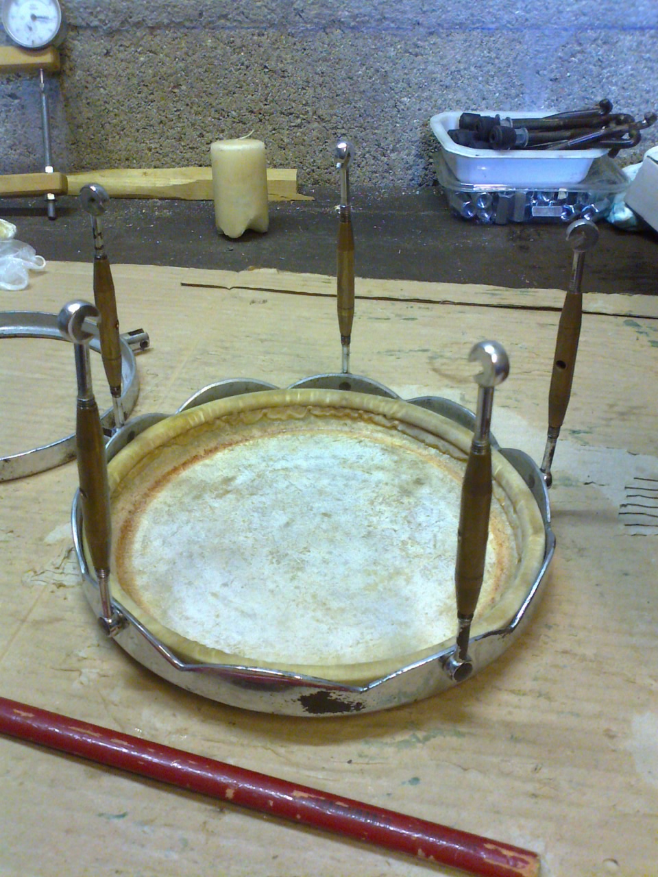 Looks like the person or maker used two crowns on one drum with a turnbuckle like part in the center. Very interesting. I am wondering if you can see any signs of wear of scraping along the lower crown? That would be one of my main concerns with those drums. The bongos however look like they have no such issues.