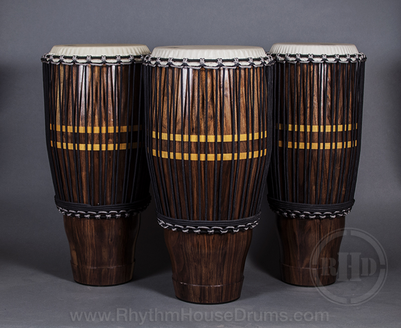 Most recent conga build. It's been a crazy learning experience going from djembes to congas. I'm loving it. These are walnut with yellow heart inlay bands. Headed with rope tuning and remo nuskyn heads. I put a rubber foot on the bottom of these and roughed the inside. The shells had a bit of a higher pitched overtone to them that I was worried about, but as soon as the heads went on, the shell tones muted out. I have a set of matadors with nuskyns and these smaller congas had a better / smoother resonance with the same amount of volume. I was stoked.