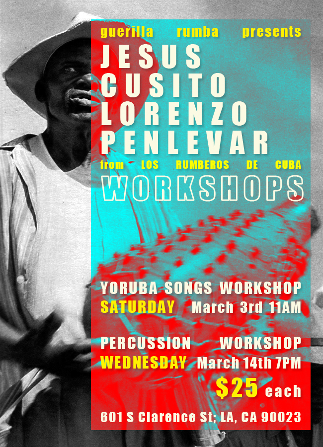 Master of Afro-Cuban drumming and singing traditions, “Cusito” Jesus Lorenzo Penalevar will be leading two workshops on the weekend of Saturday, March 3, 2012 in the Los Angeles area.